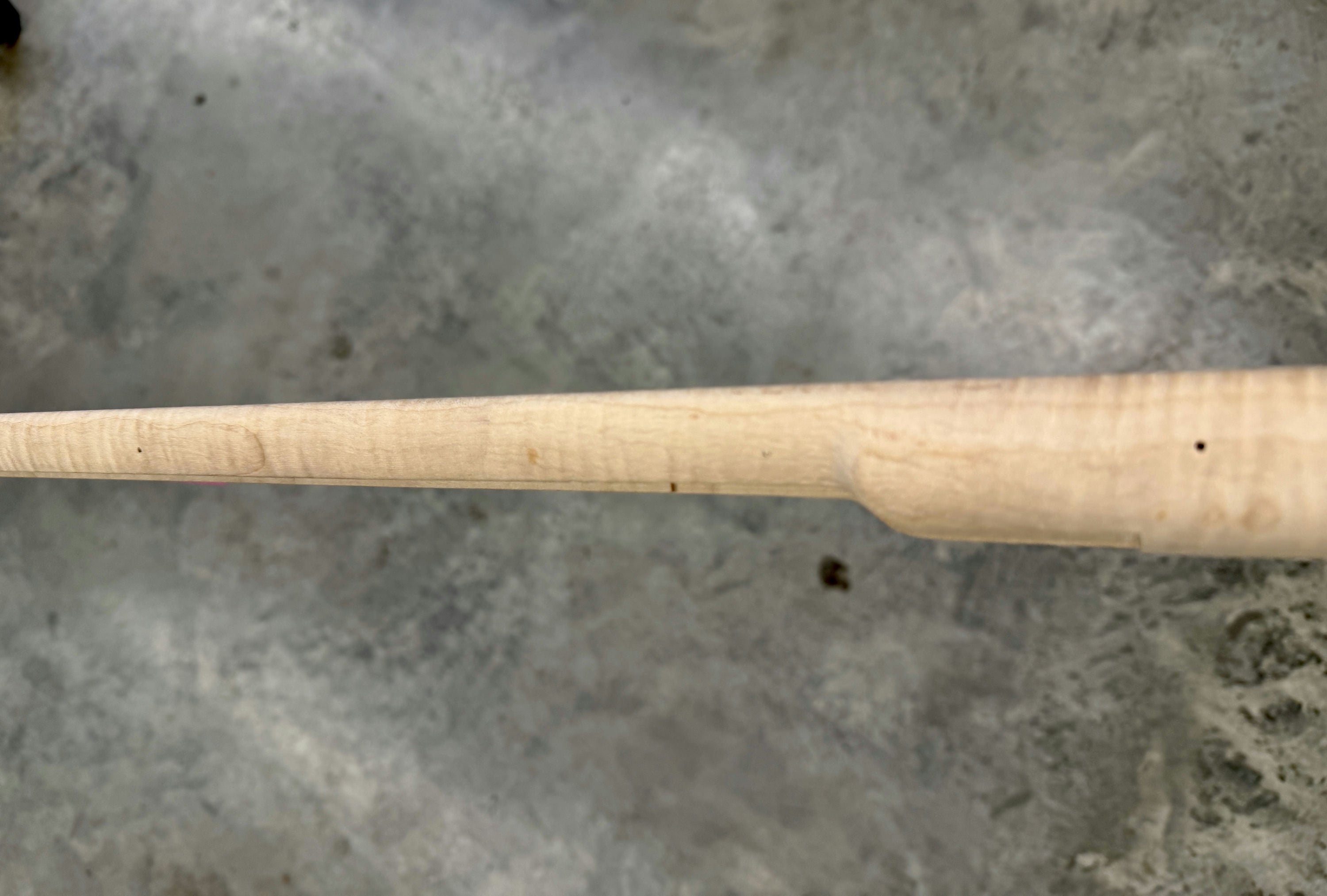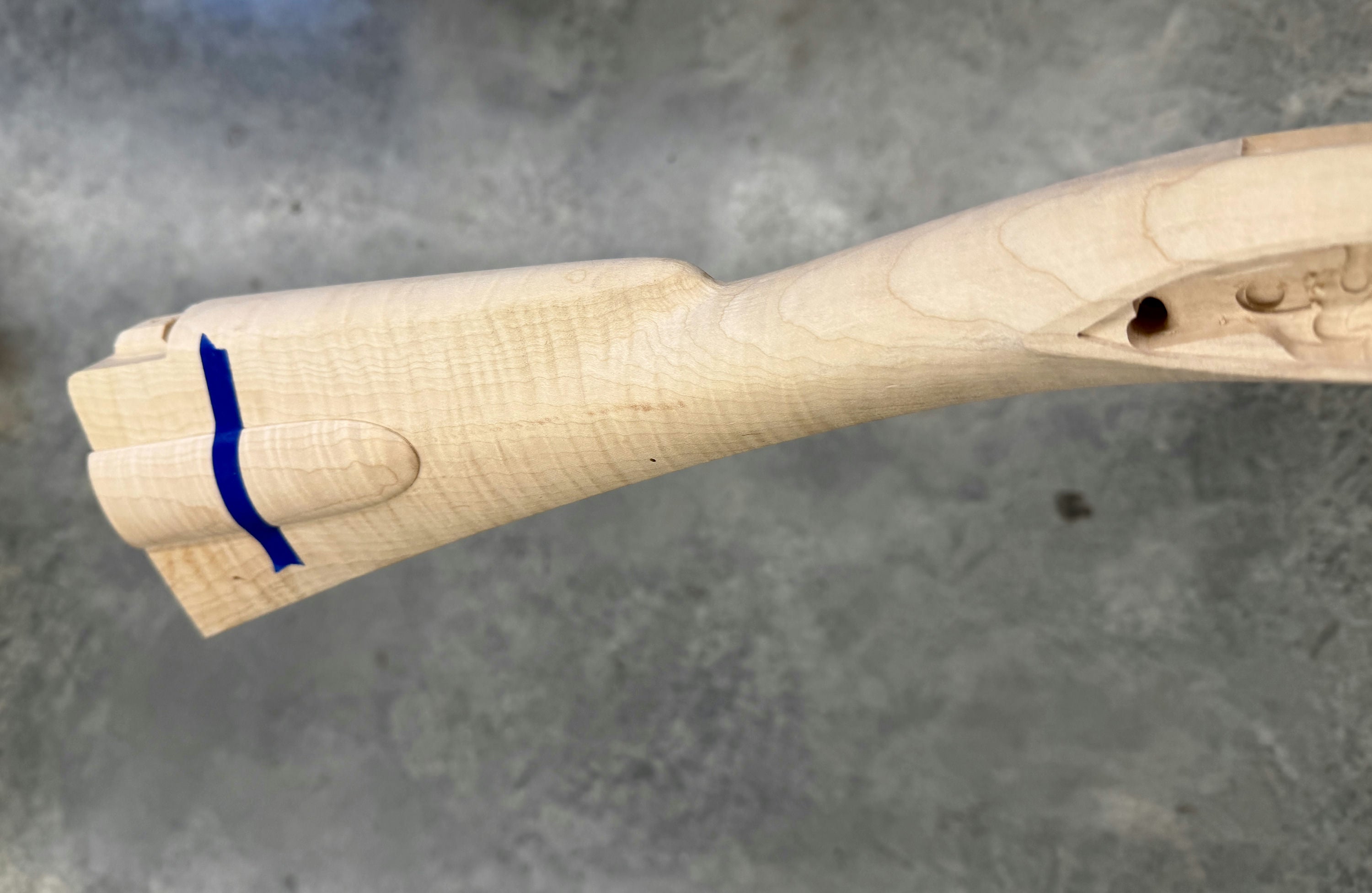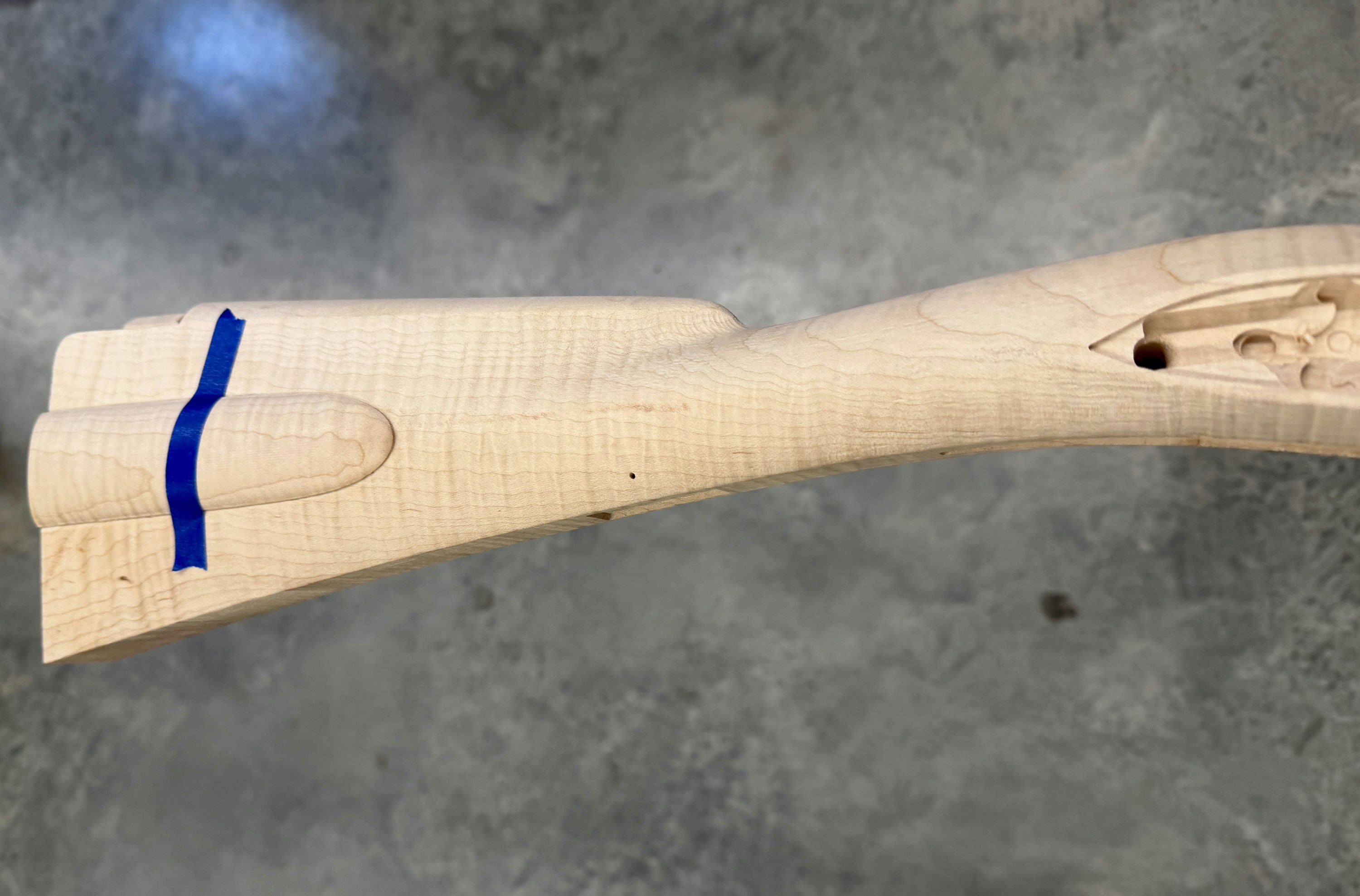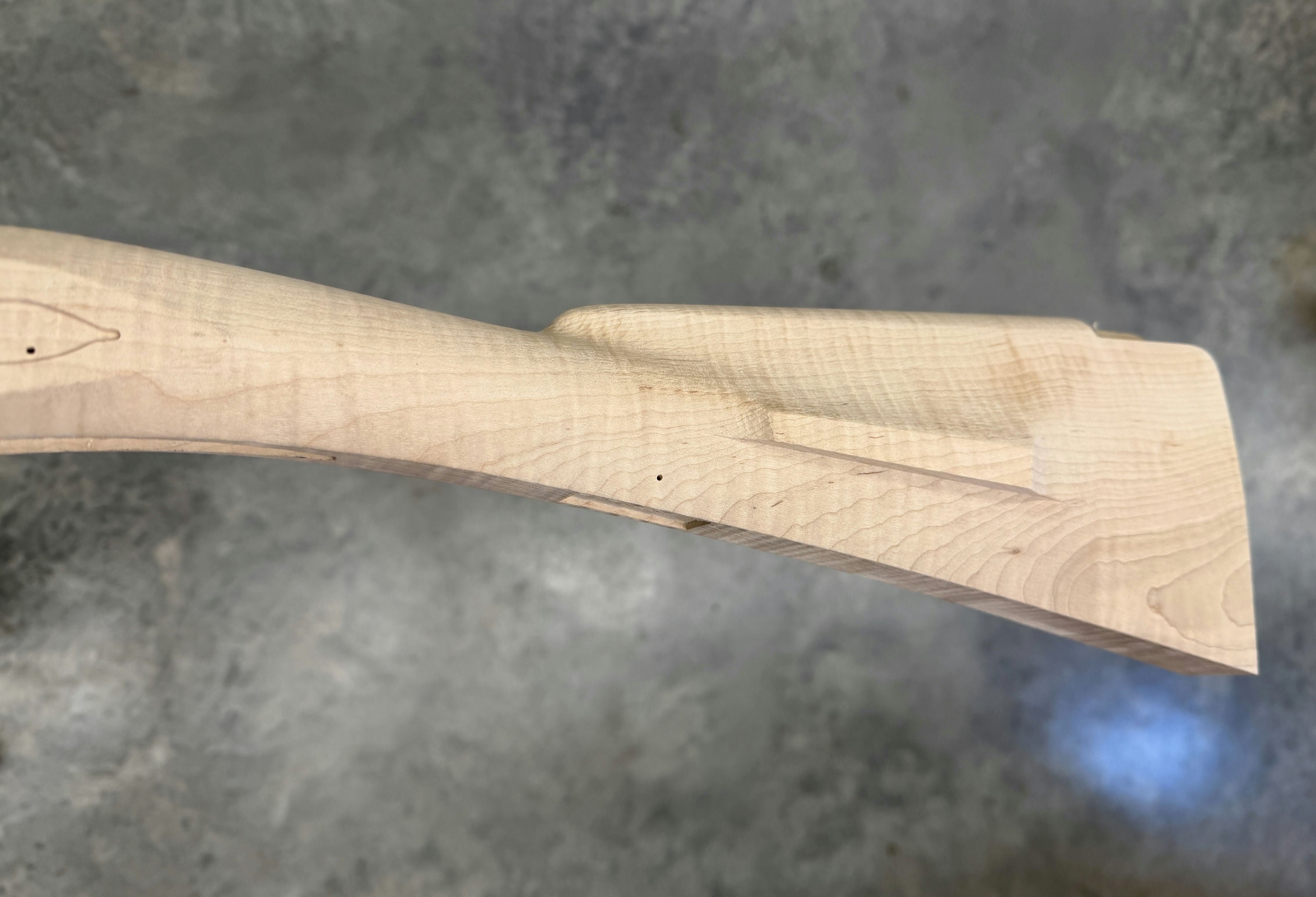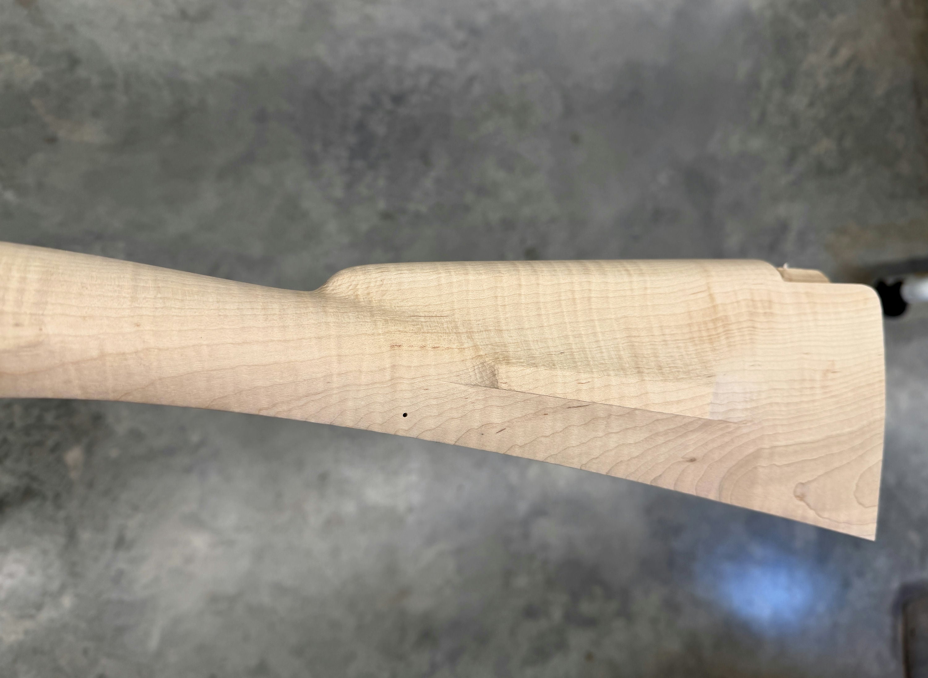 Extra fancy maple stock with chips in the trigger guard inlet - wood included for repair. Also slight discoloration on the fore stock.