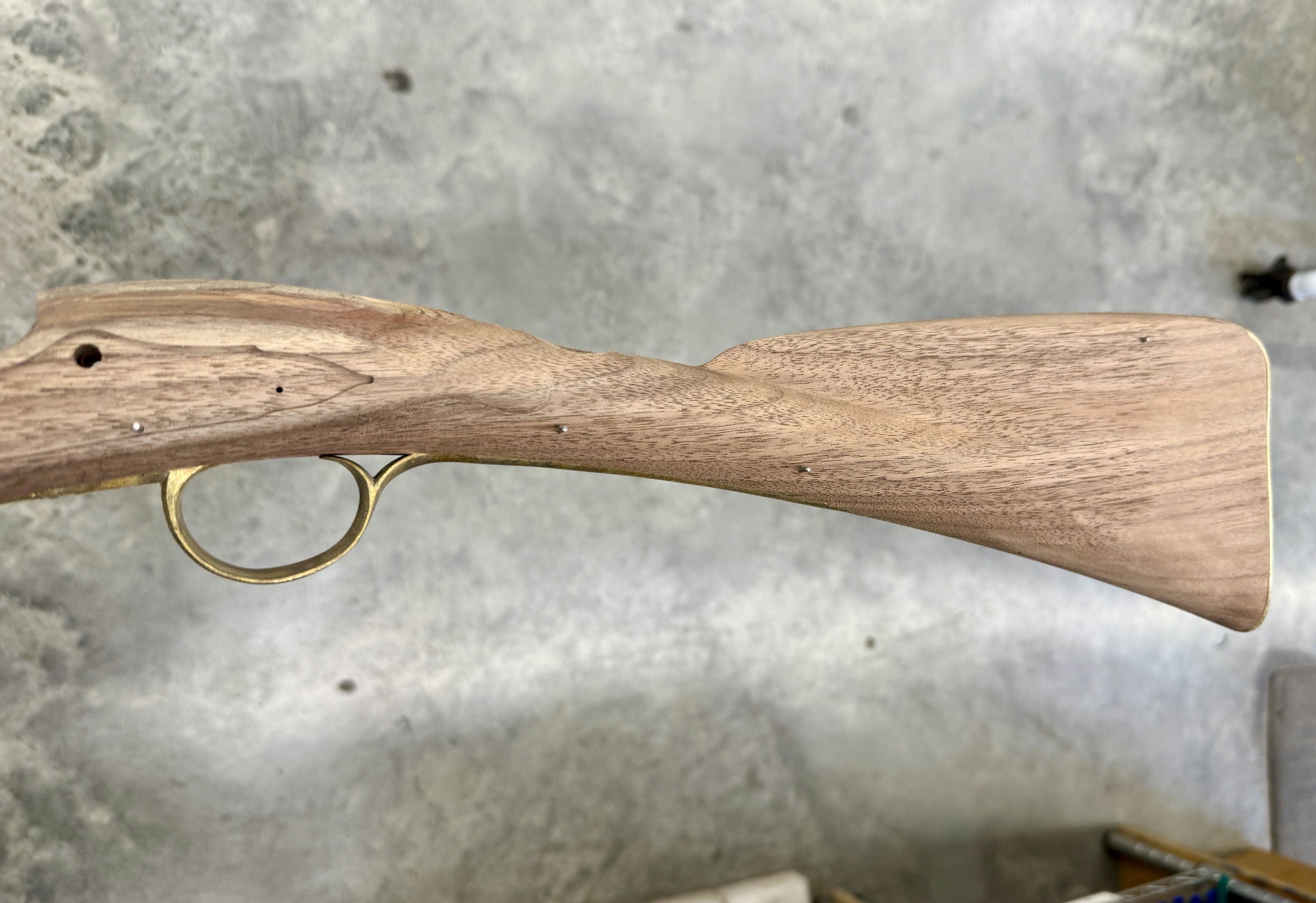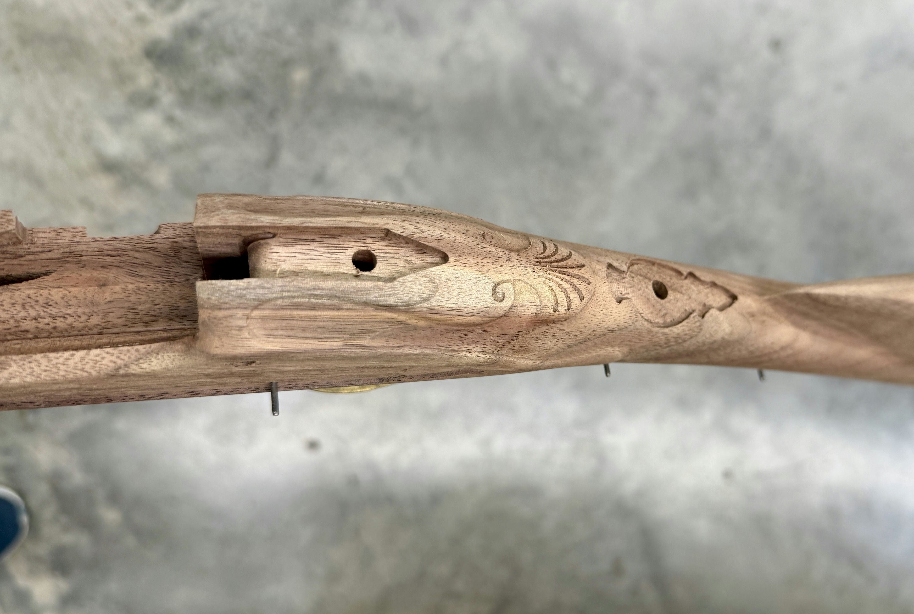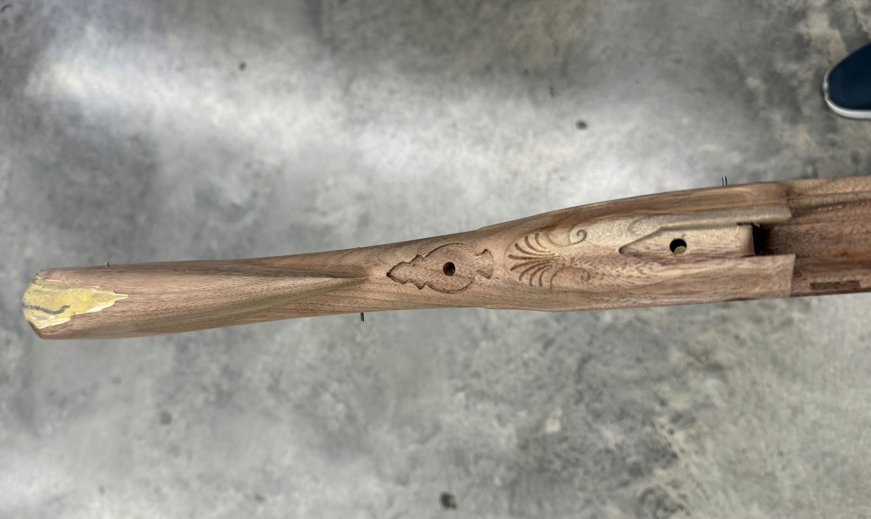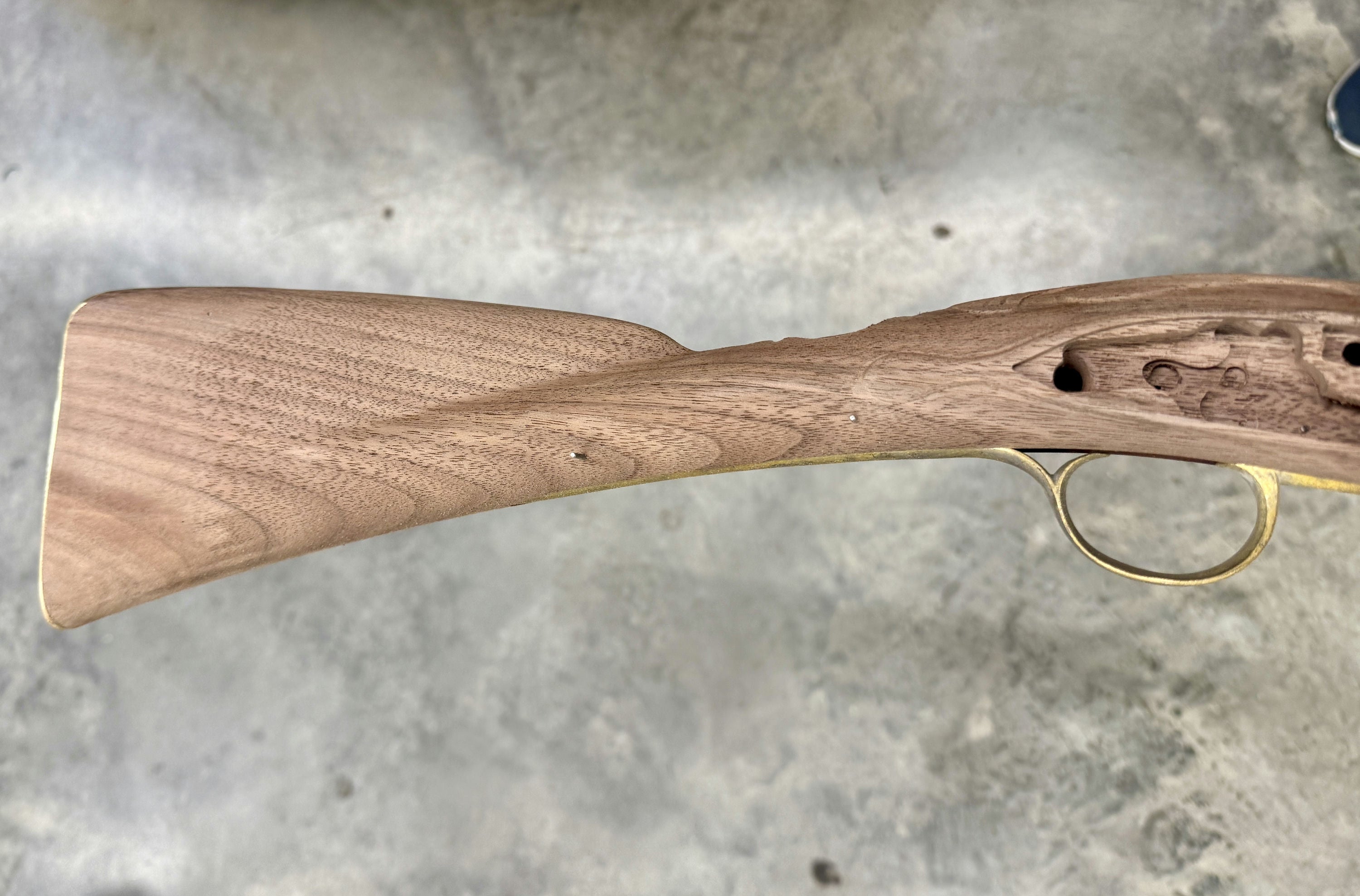 - CNC machined stock for extremely close tolerances and fine surface finish, embellished with a relief shell carving around the tang, as well as relief lock moldings and beaver tails.