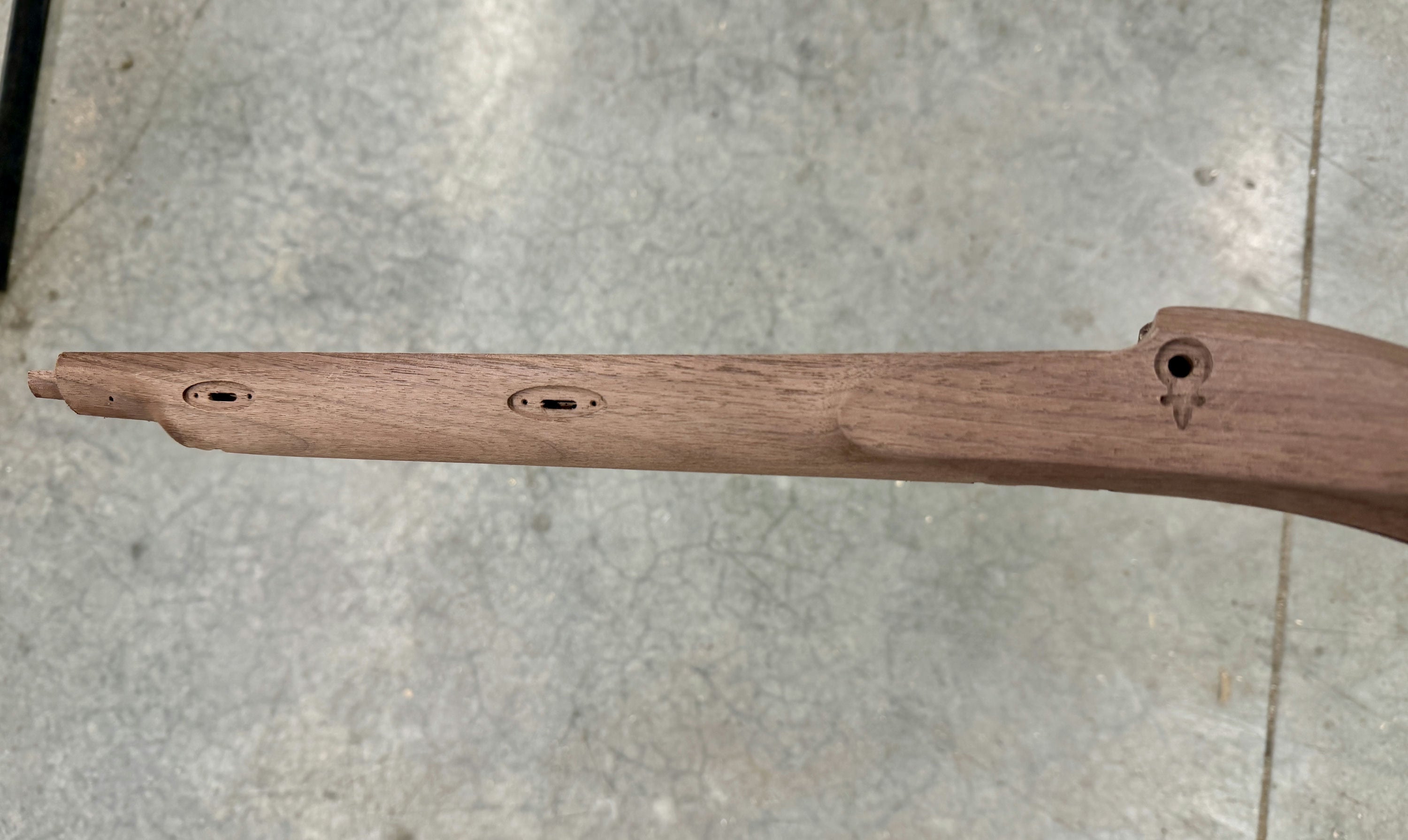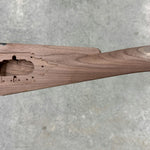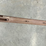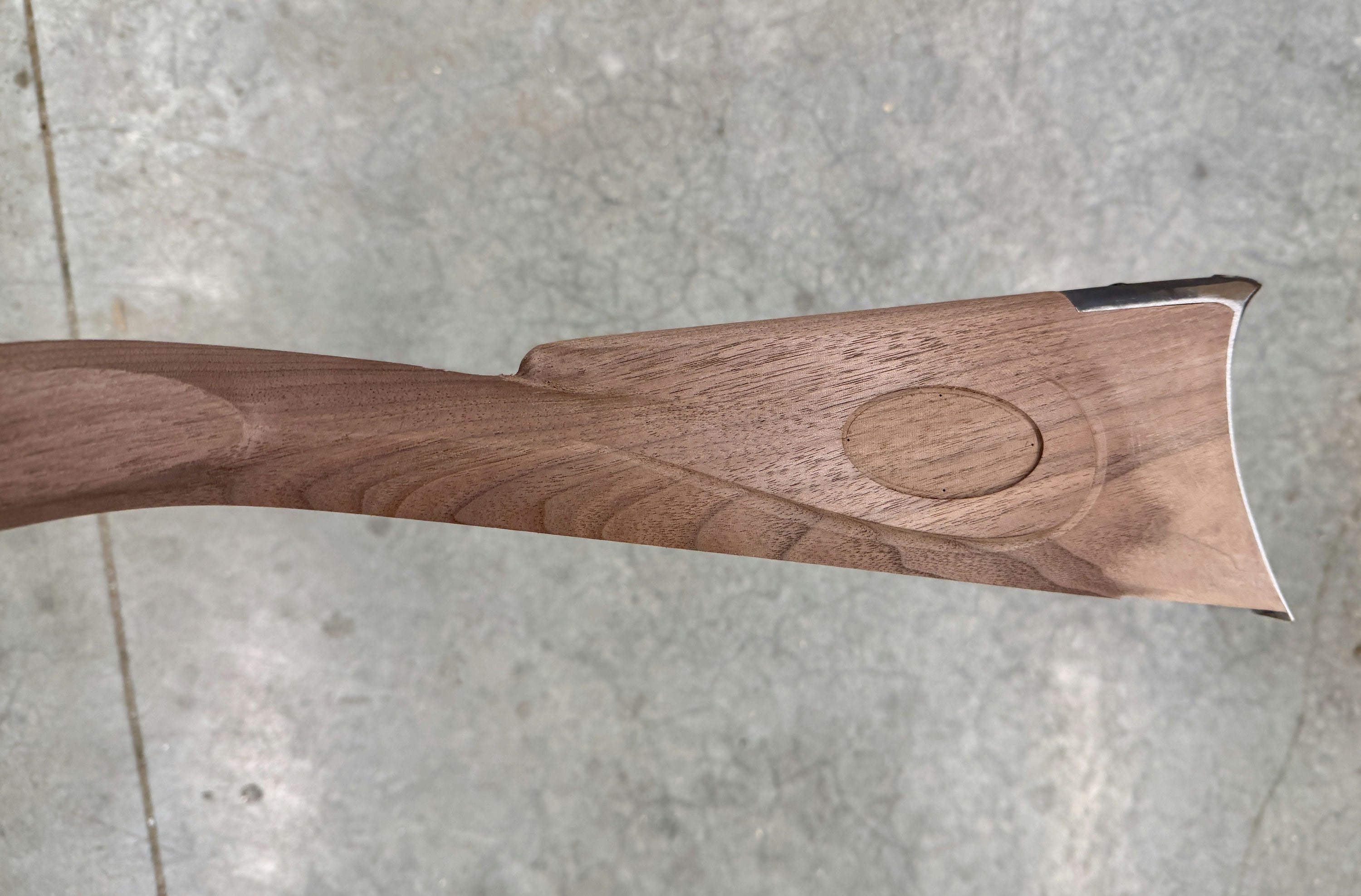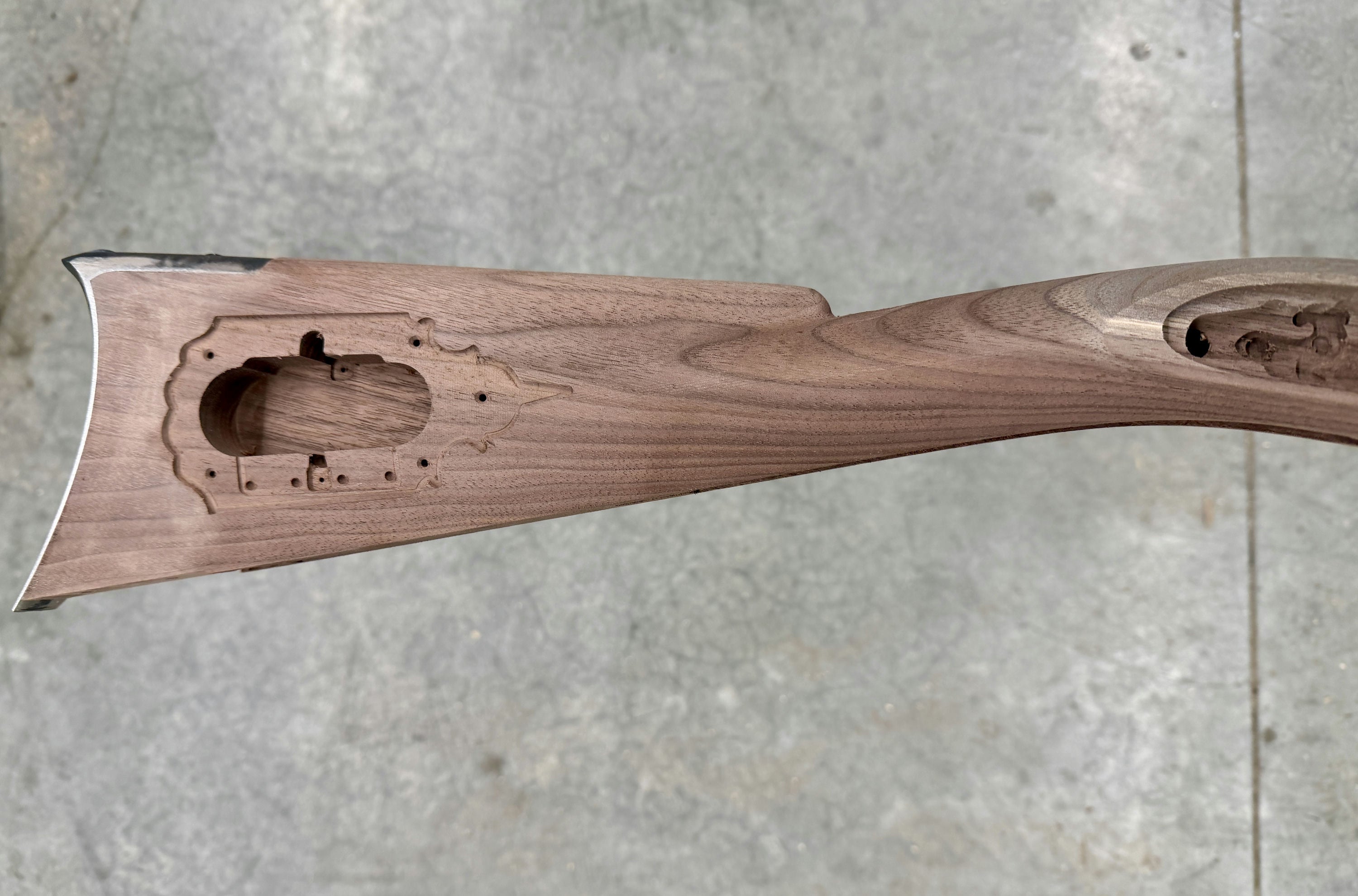Walnut stock with sap wood by the lock/tang inlets. Kit includes the iron patchbox and German silver inlay package as well.