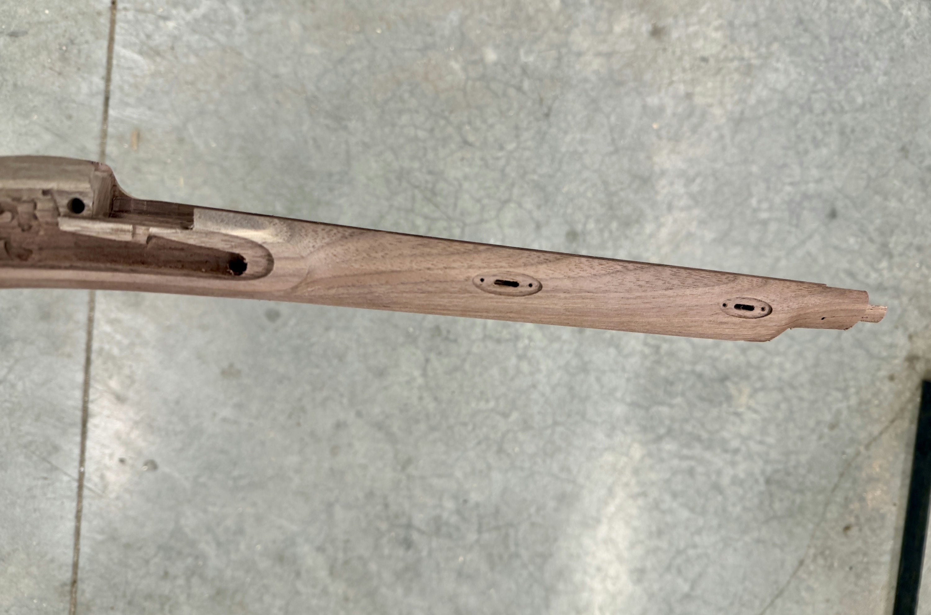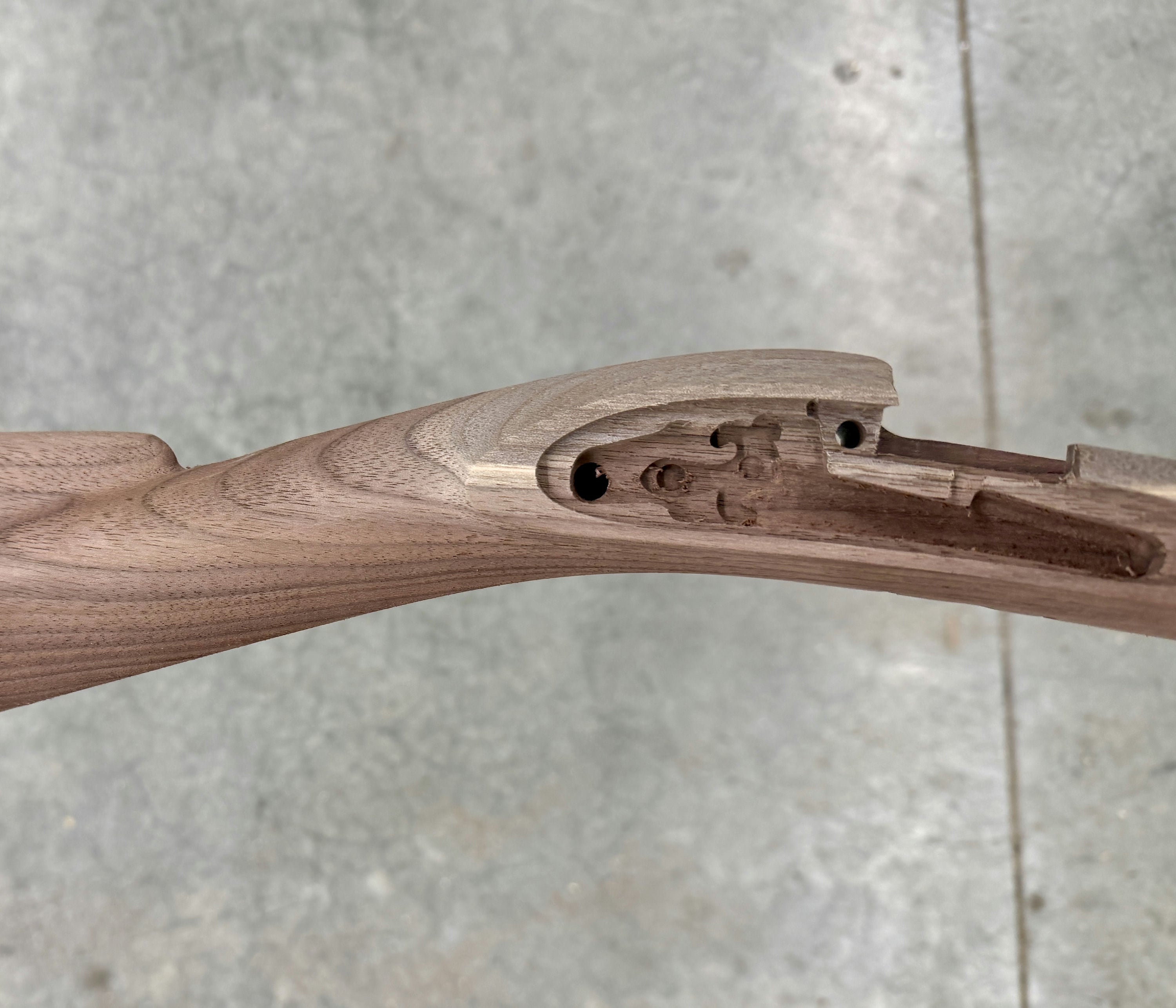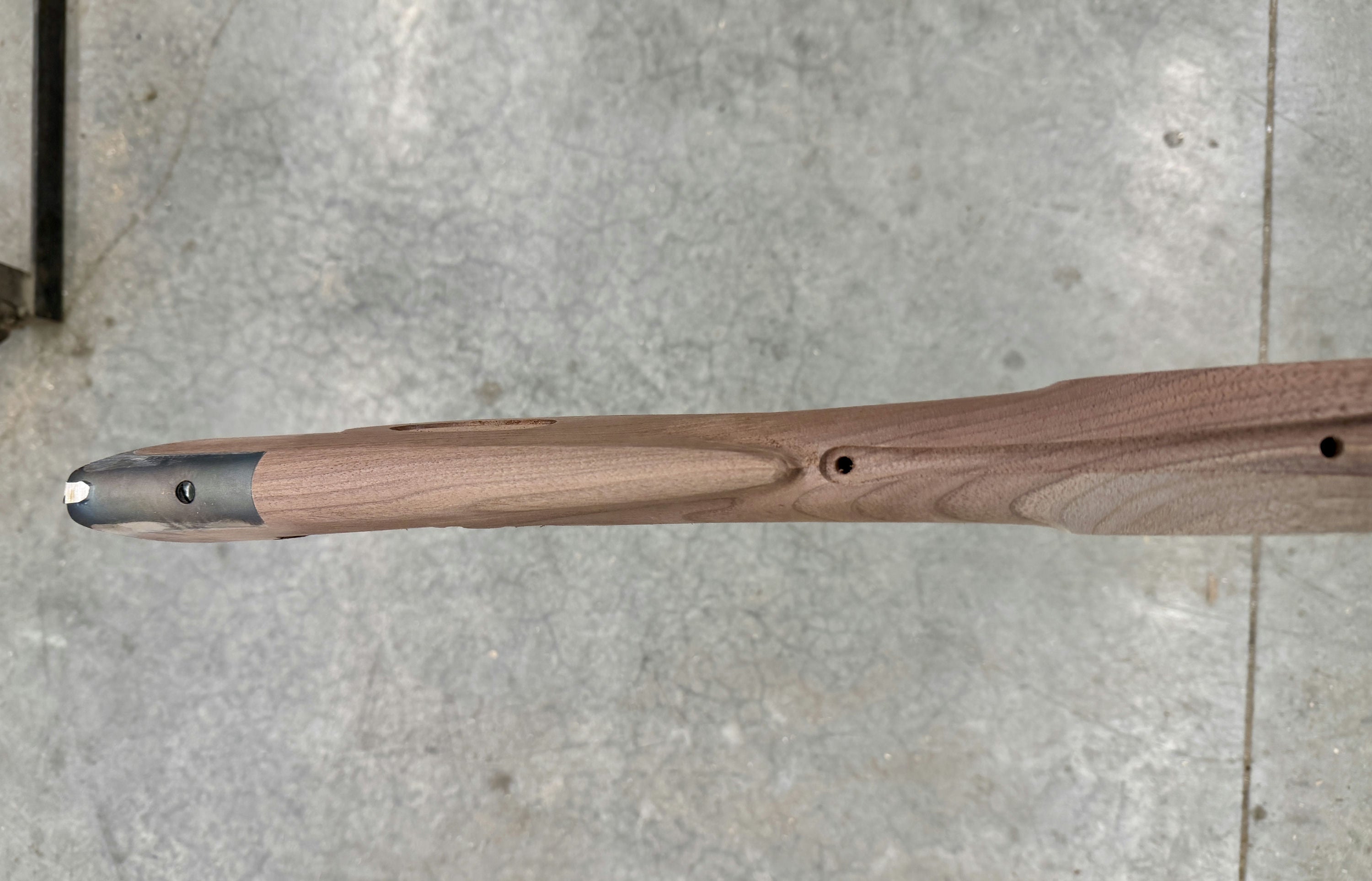 Walnut stock with sap wood by the lock/tang inlets. Kit includes the iron patchbox and German silver inlay package as well.