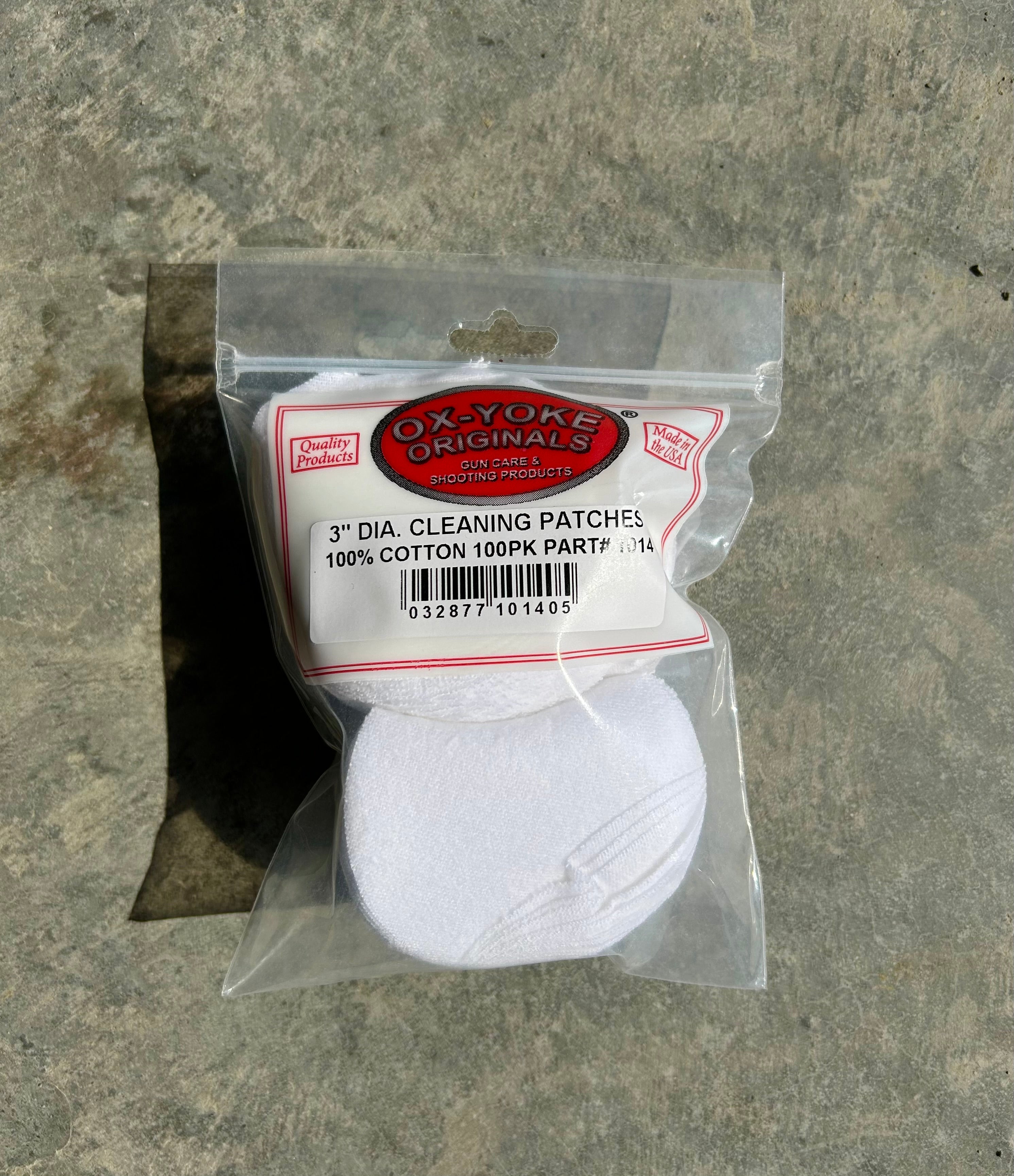 Ox-Yoke 100% Cotton Round Cleaning Patches-- cleaning patches are die-cut from 100% white cotton flannel. The natural absorbency of cotton fibers will safely remove fouling and dirt from the bore