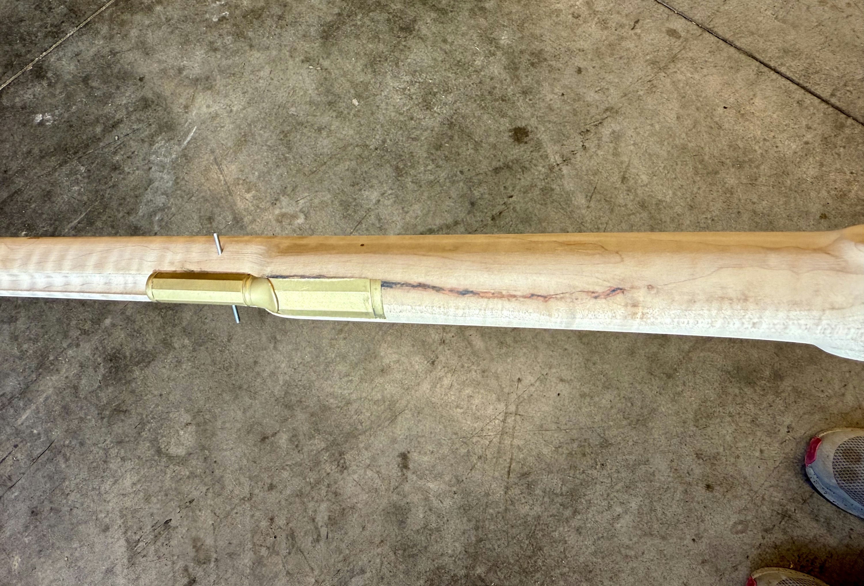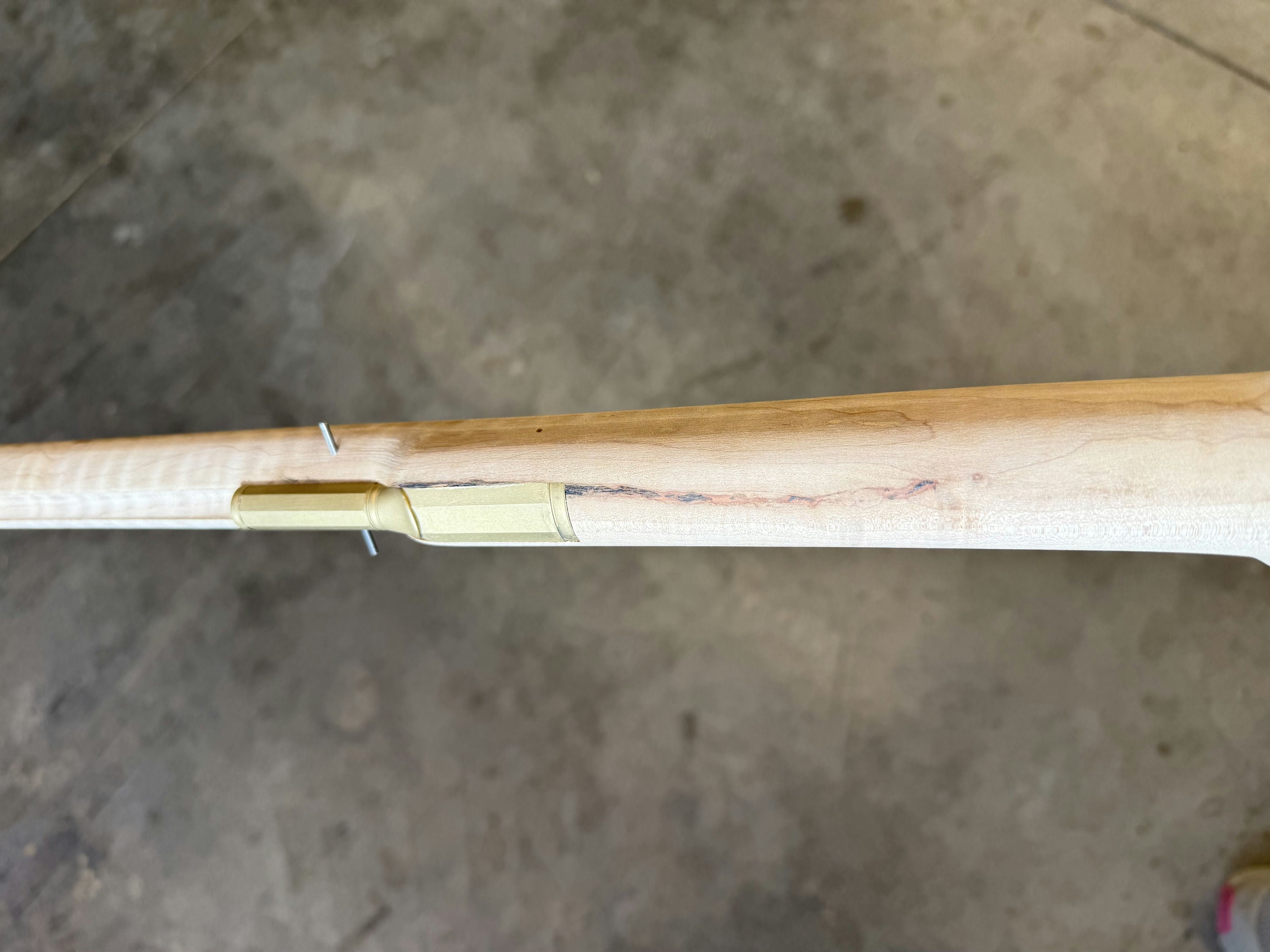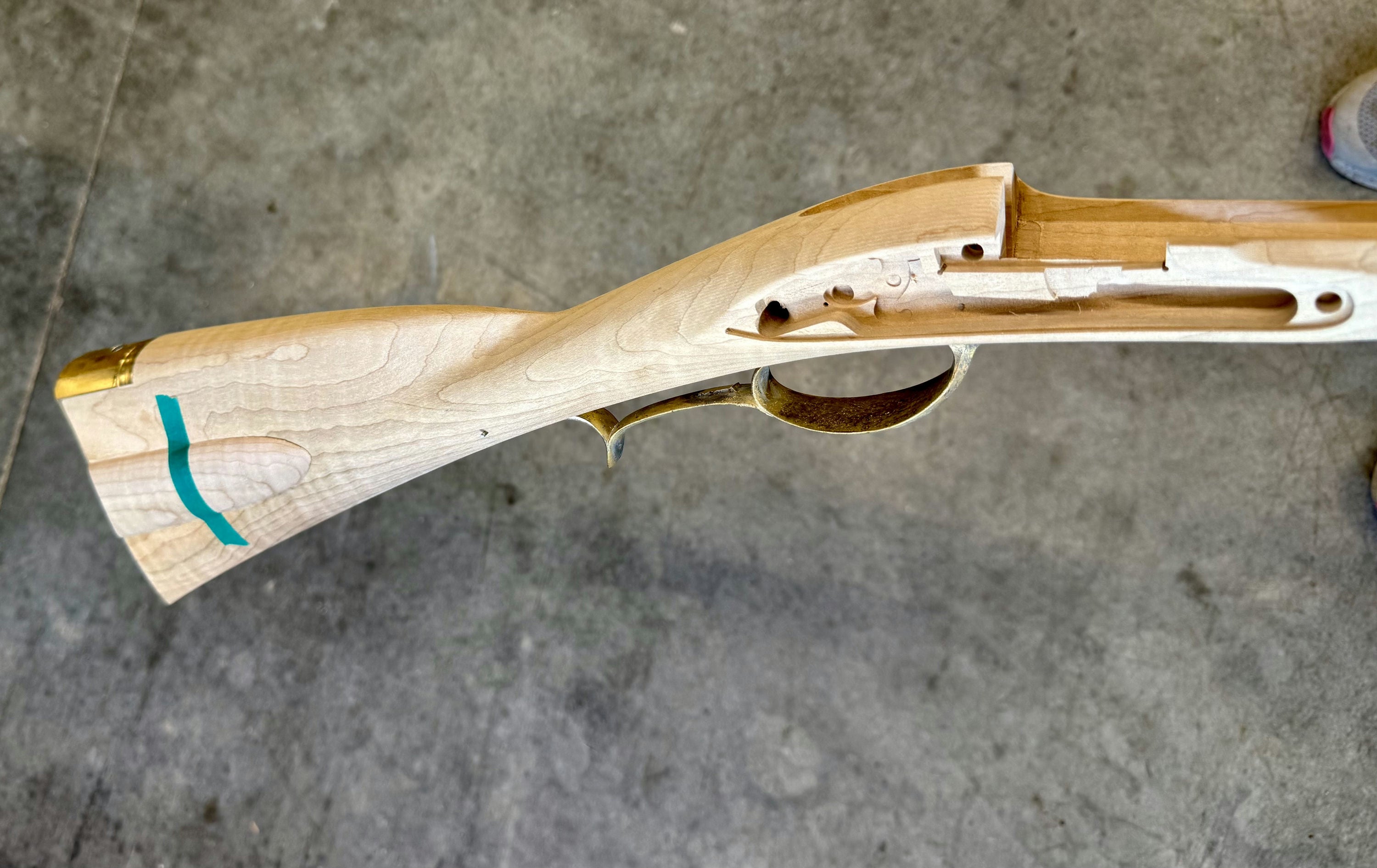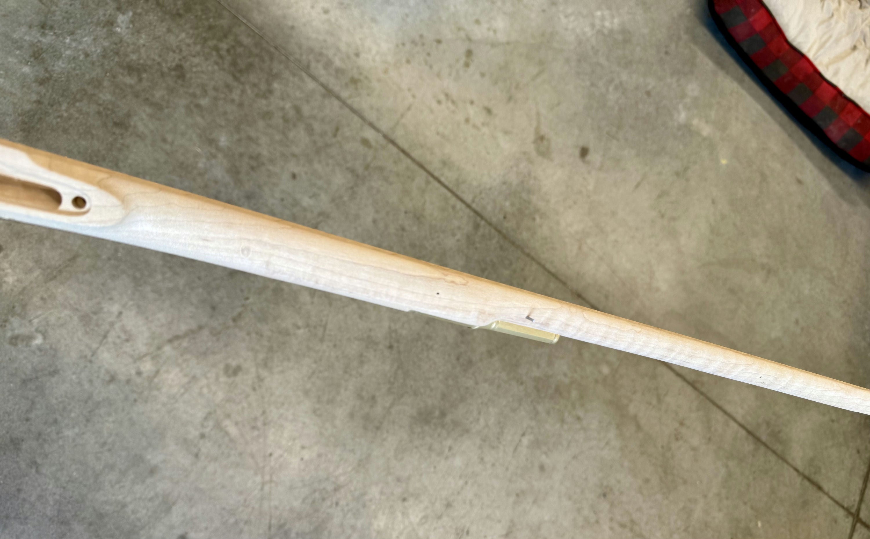 Fancy maple stock with a filled bark inclusion by the entry pipe.