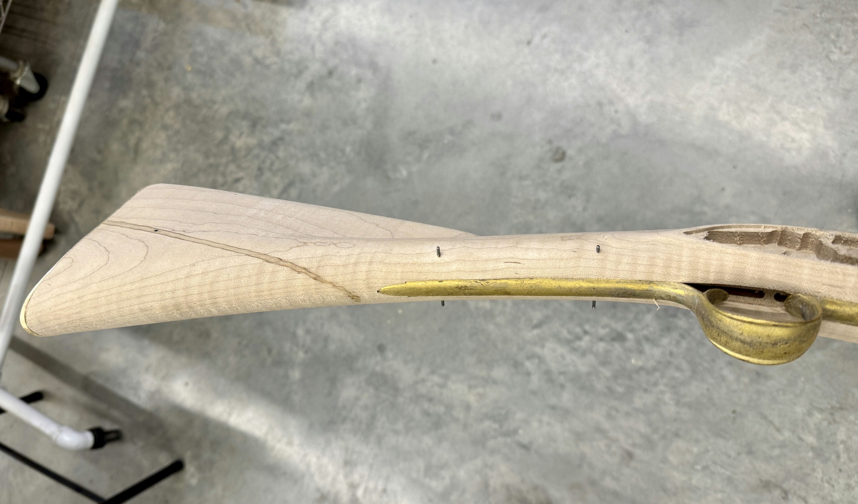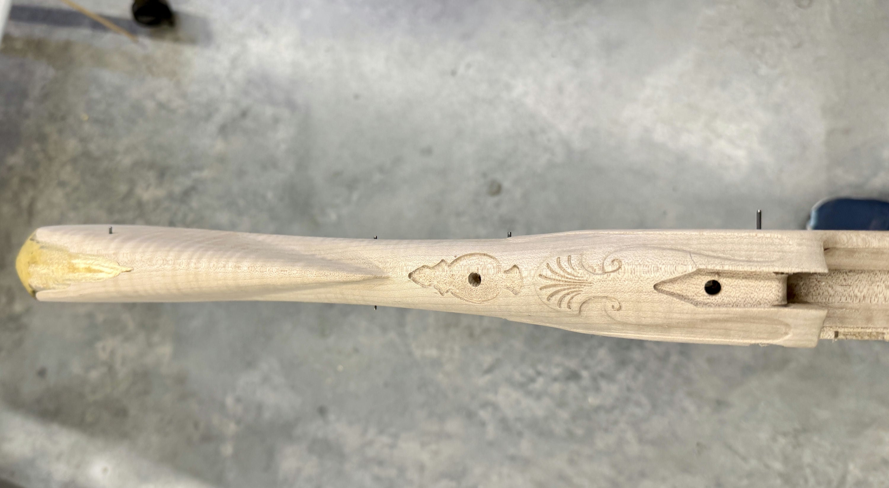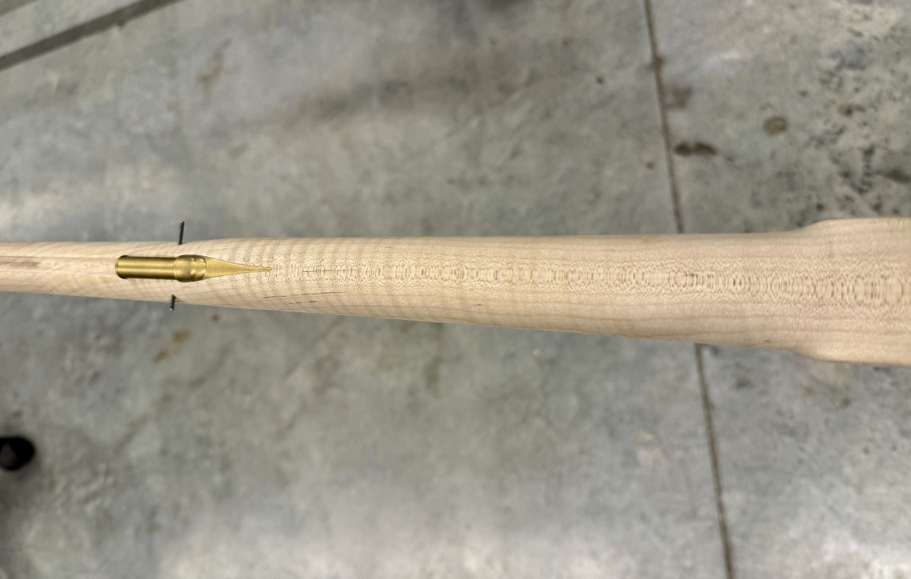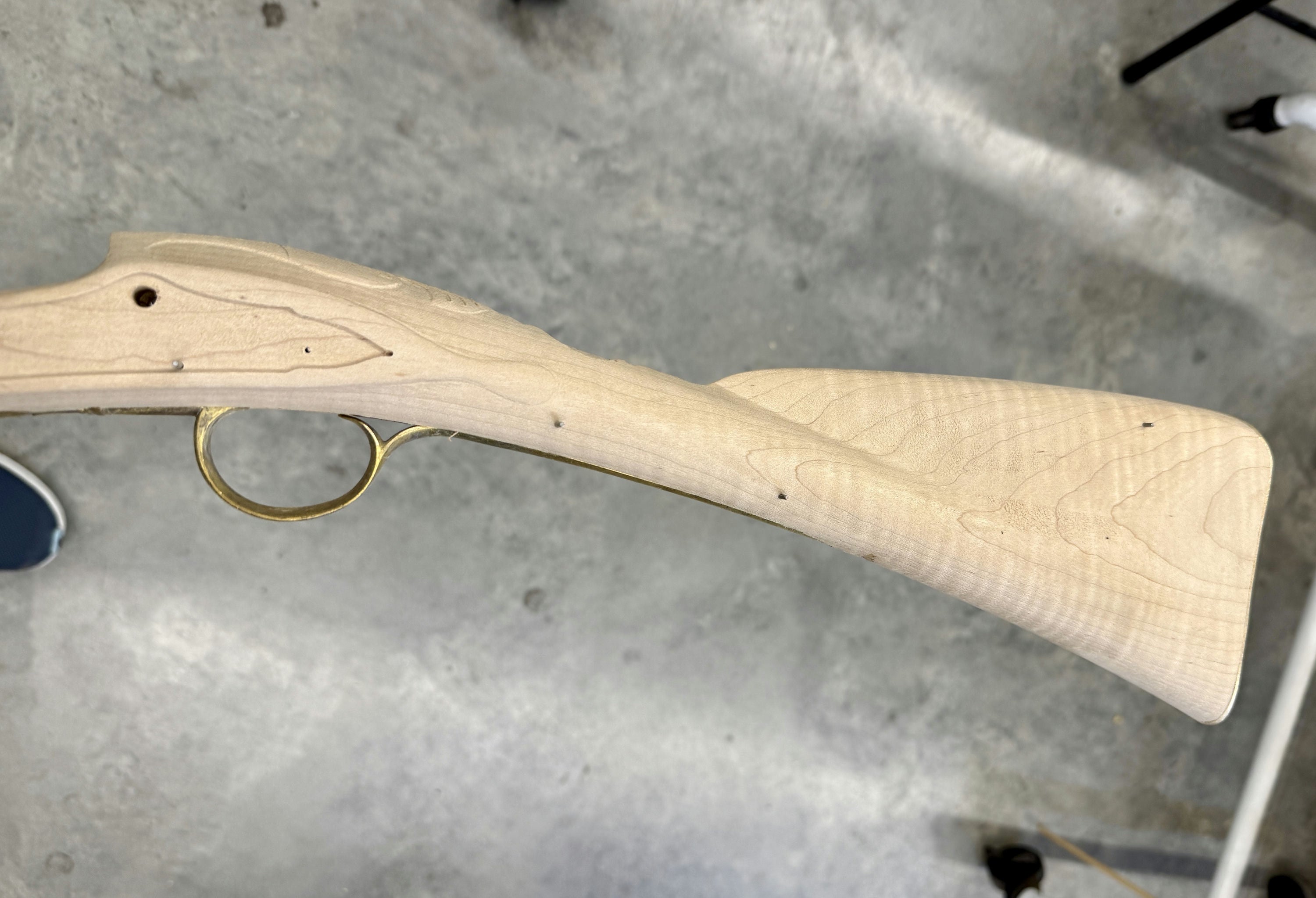 Standard maple stock with a worm stain and filled hole.
