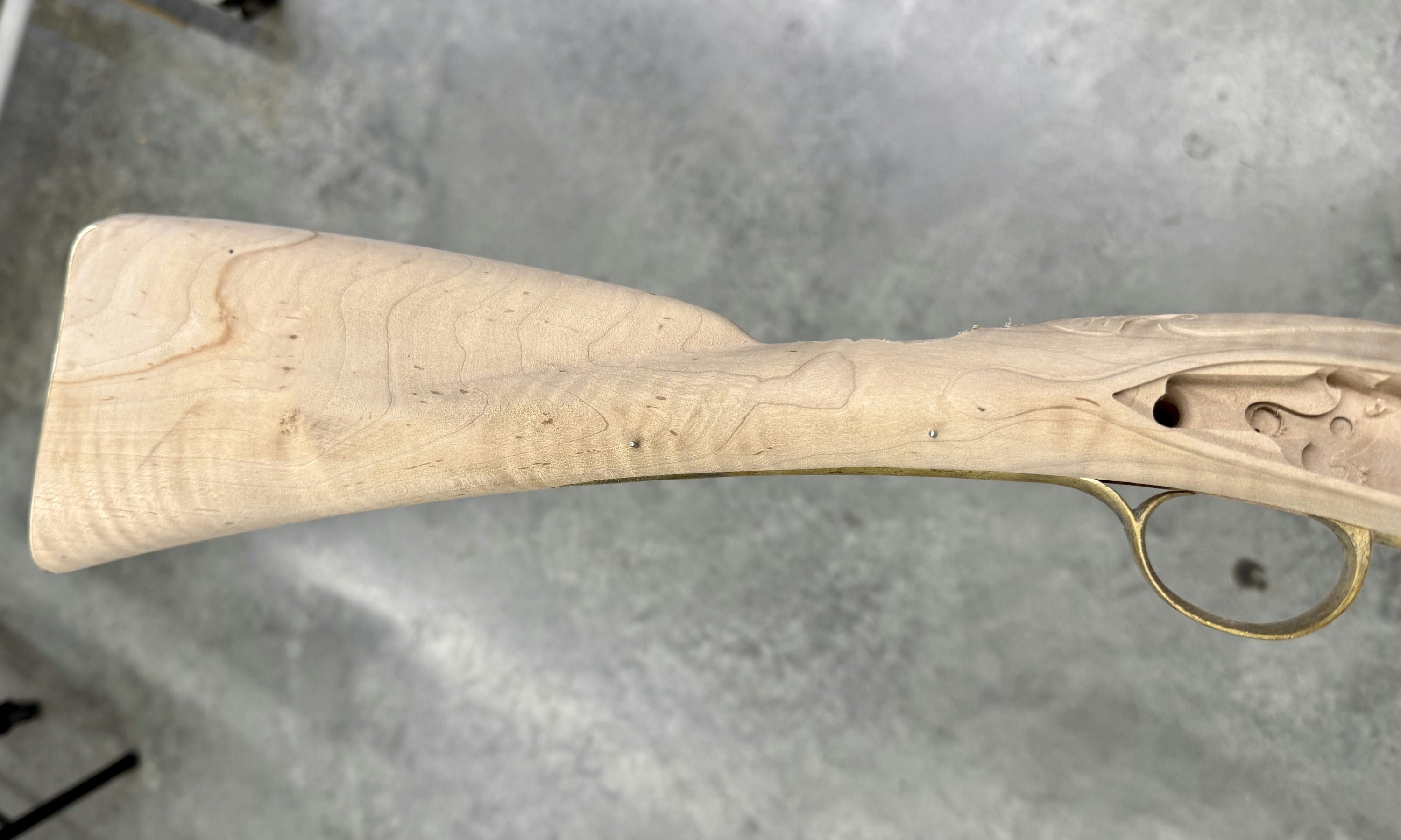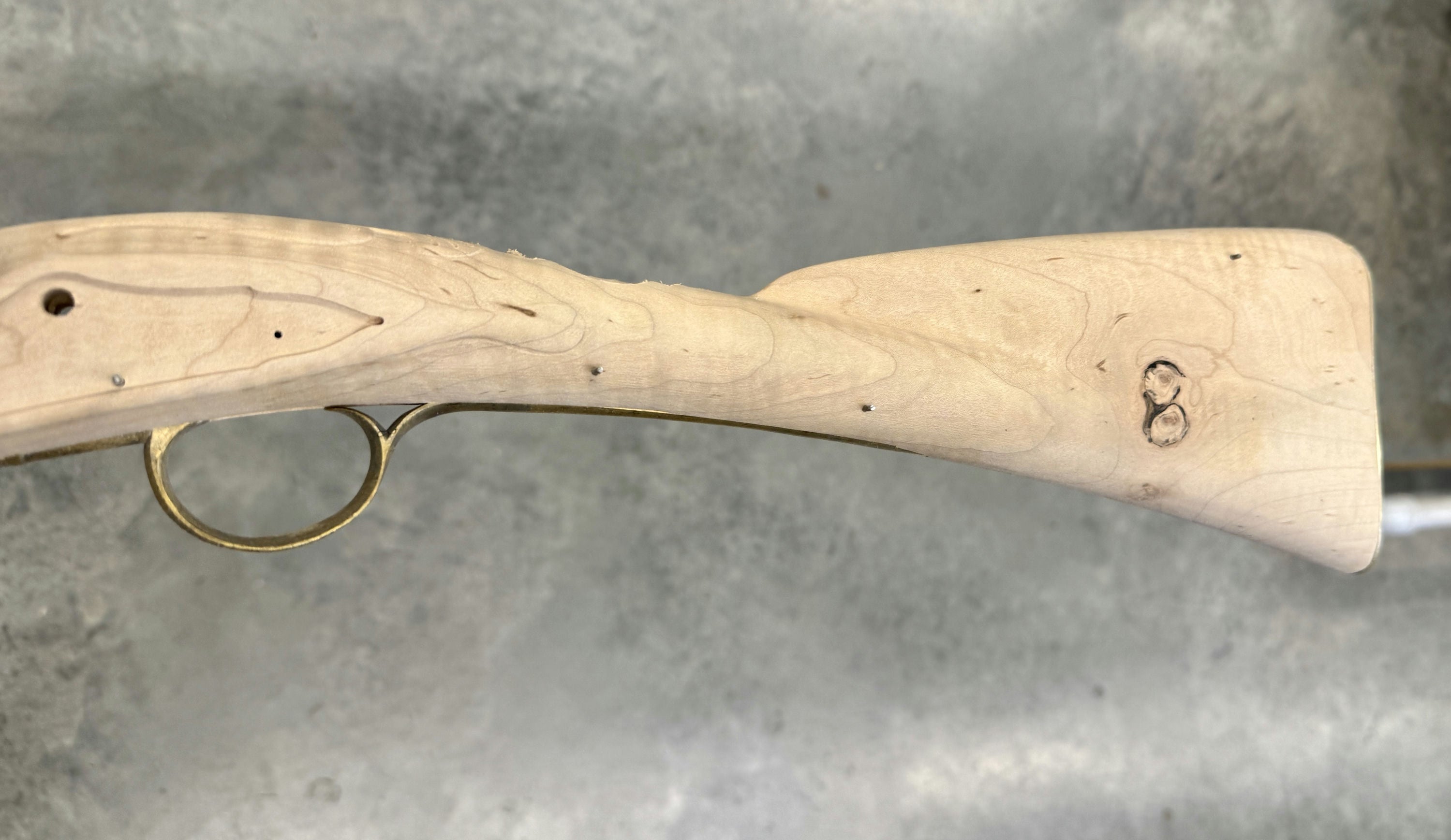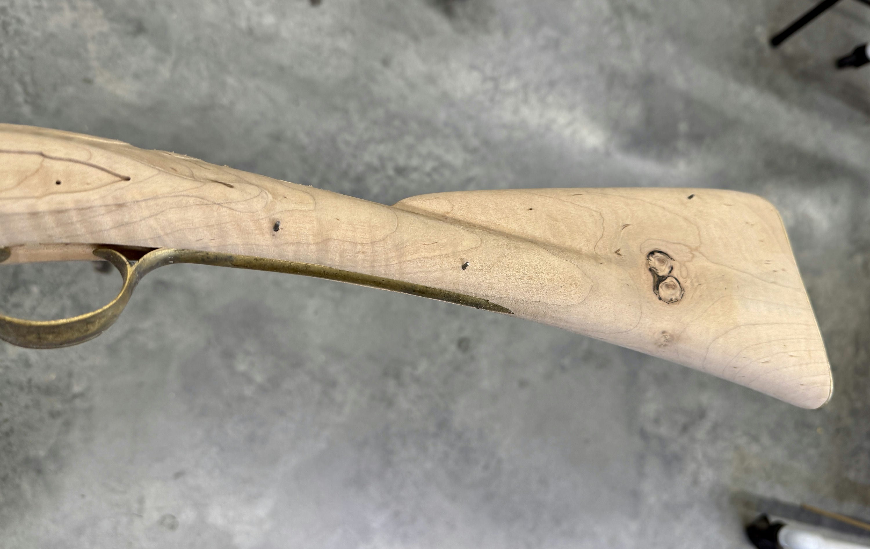 Stock between standard and fancy maple with a filled knot in the butt stock.