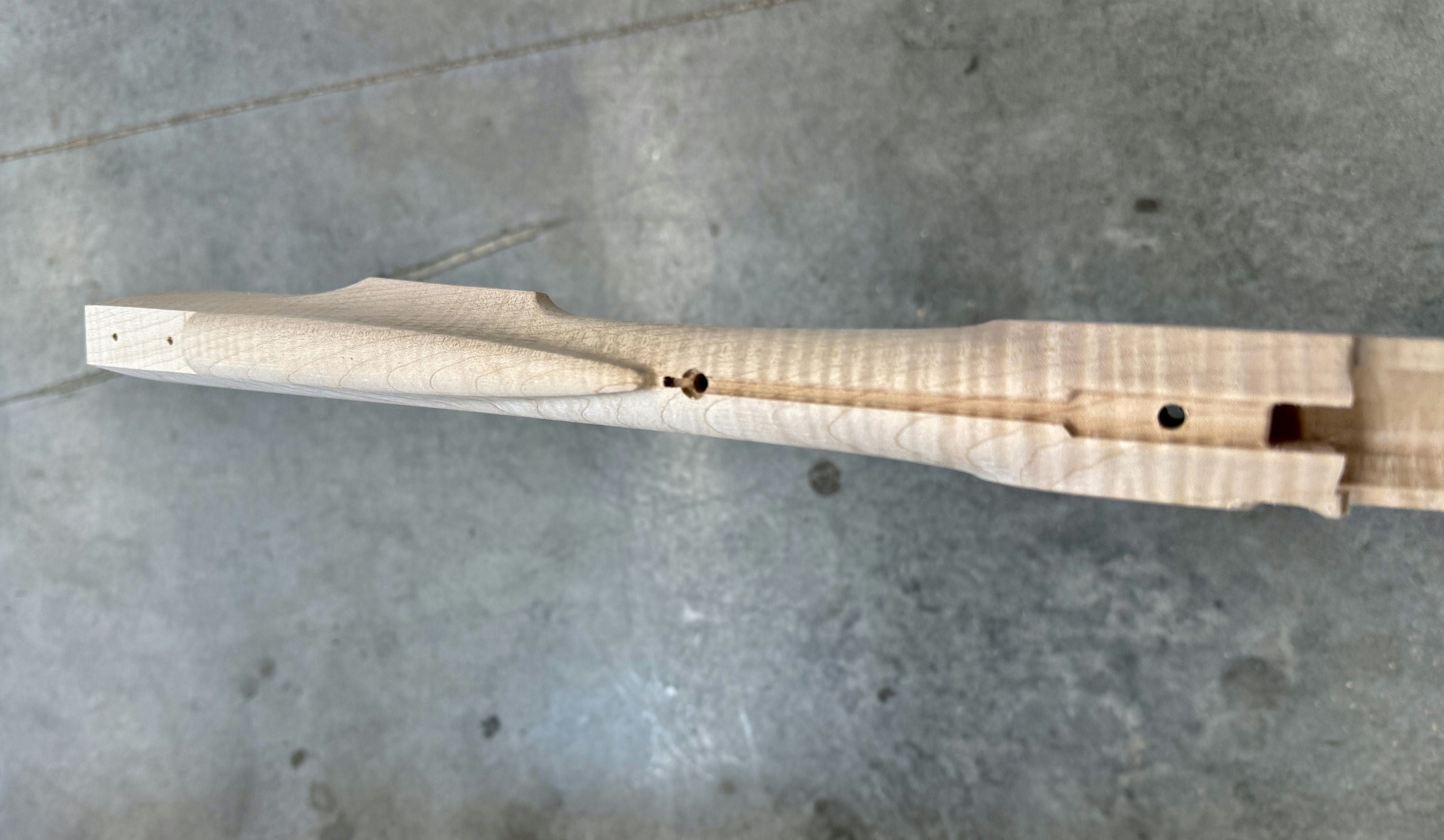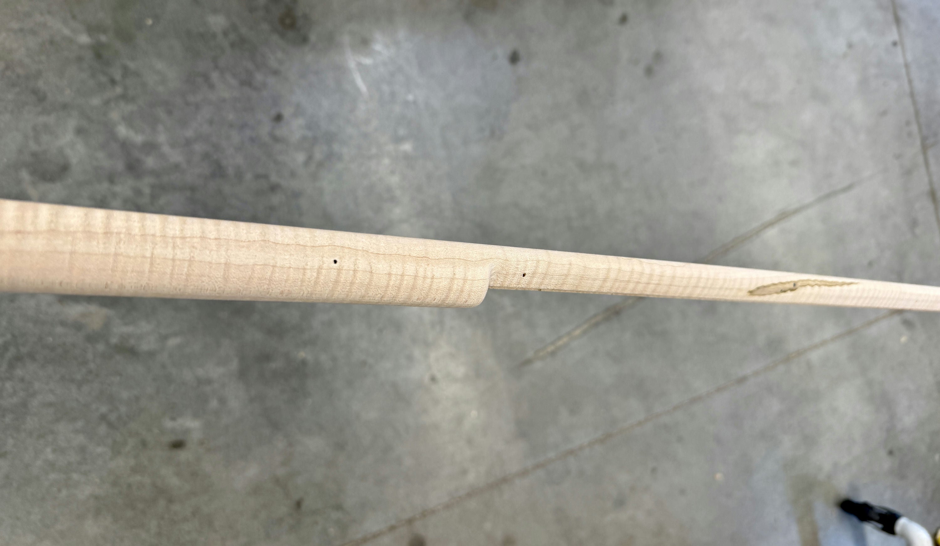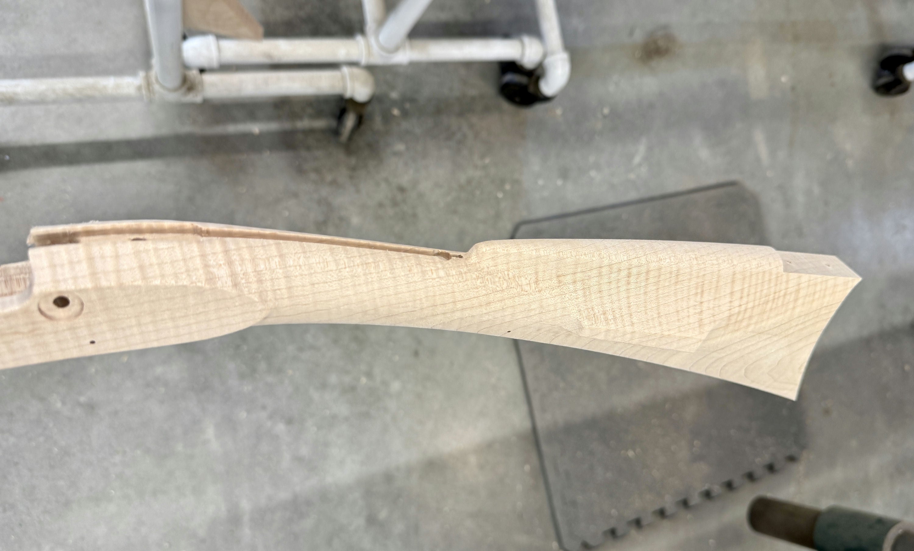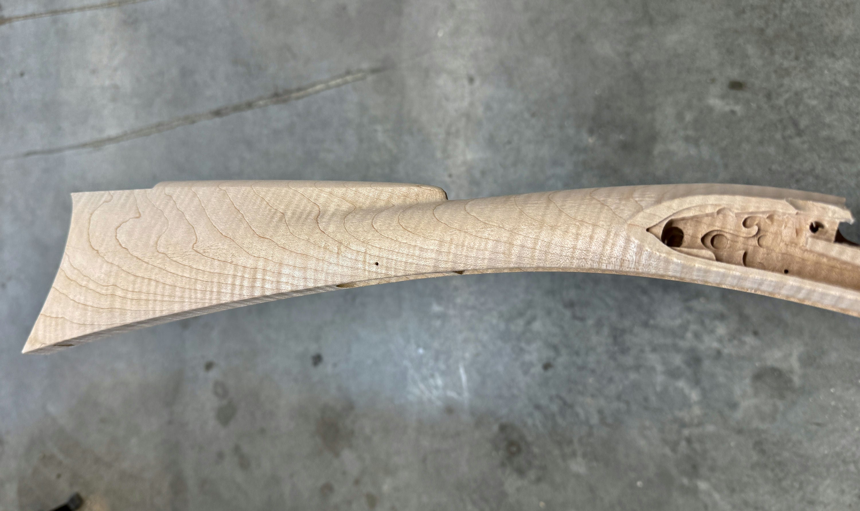 Extra fancy maple stock with a worm stain and filled hole on the forestock and a small stain on the toe line.
