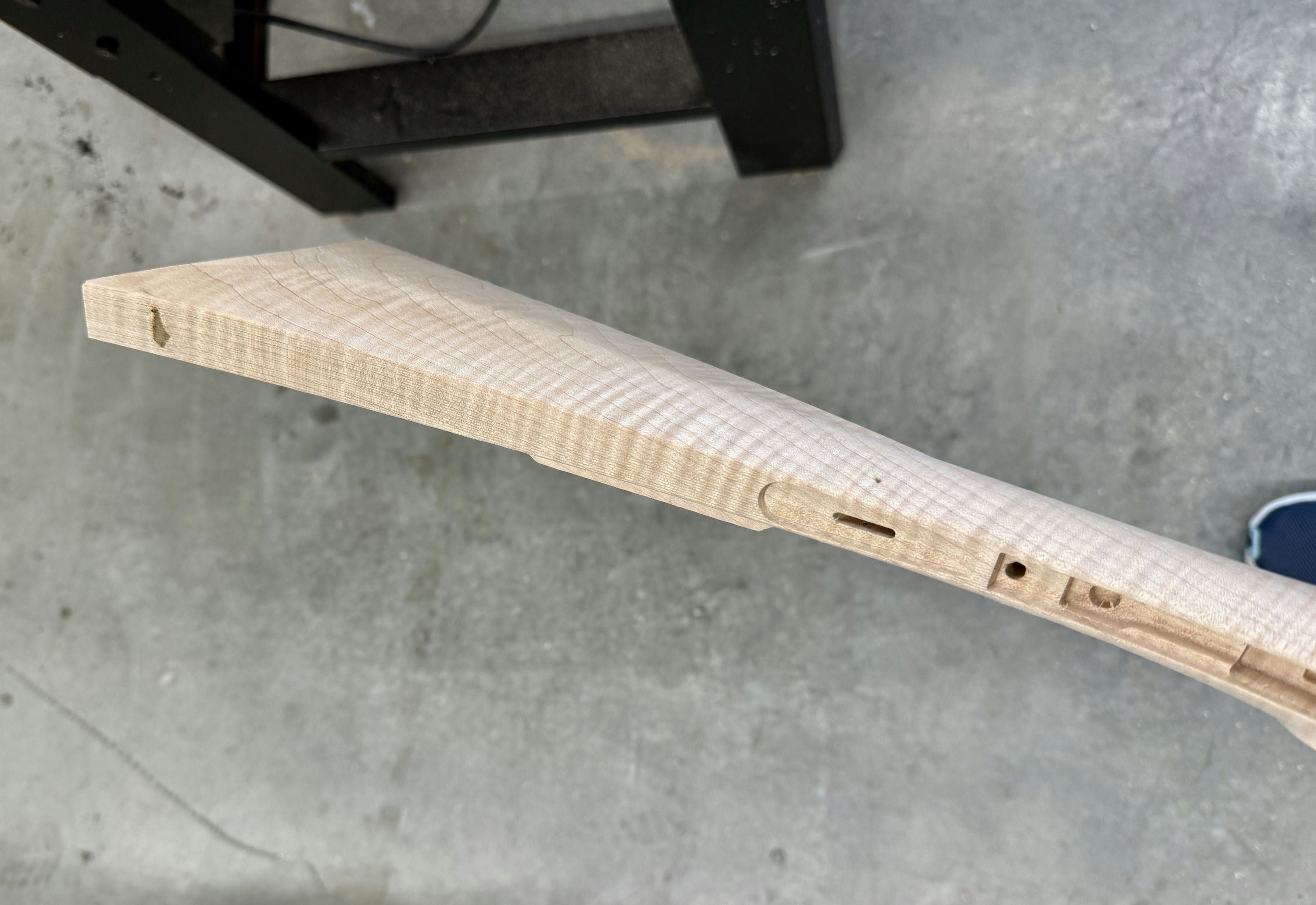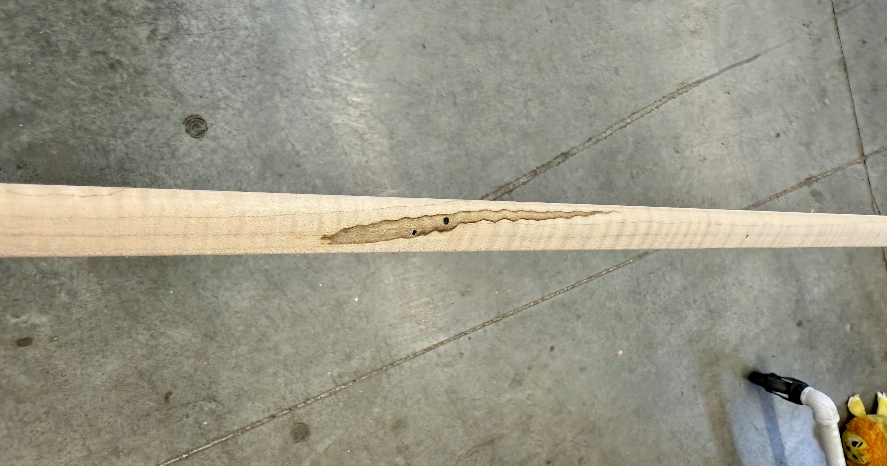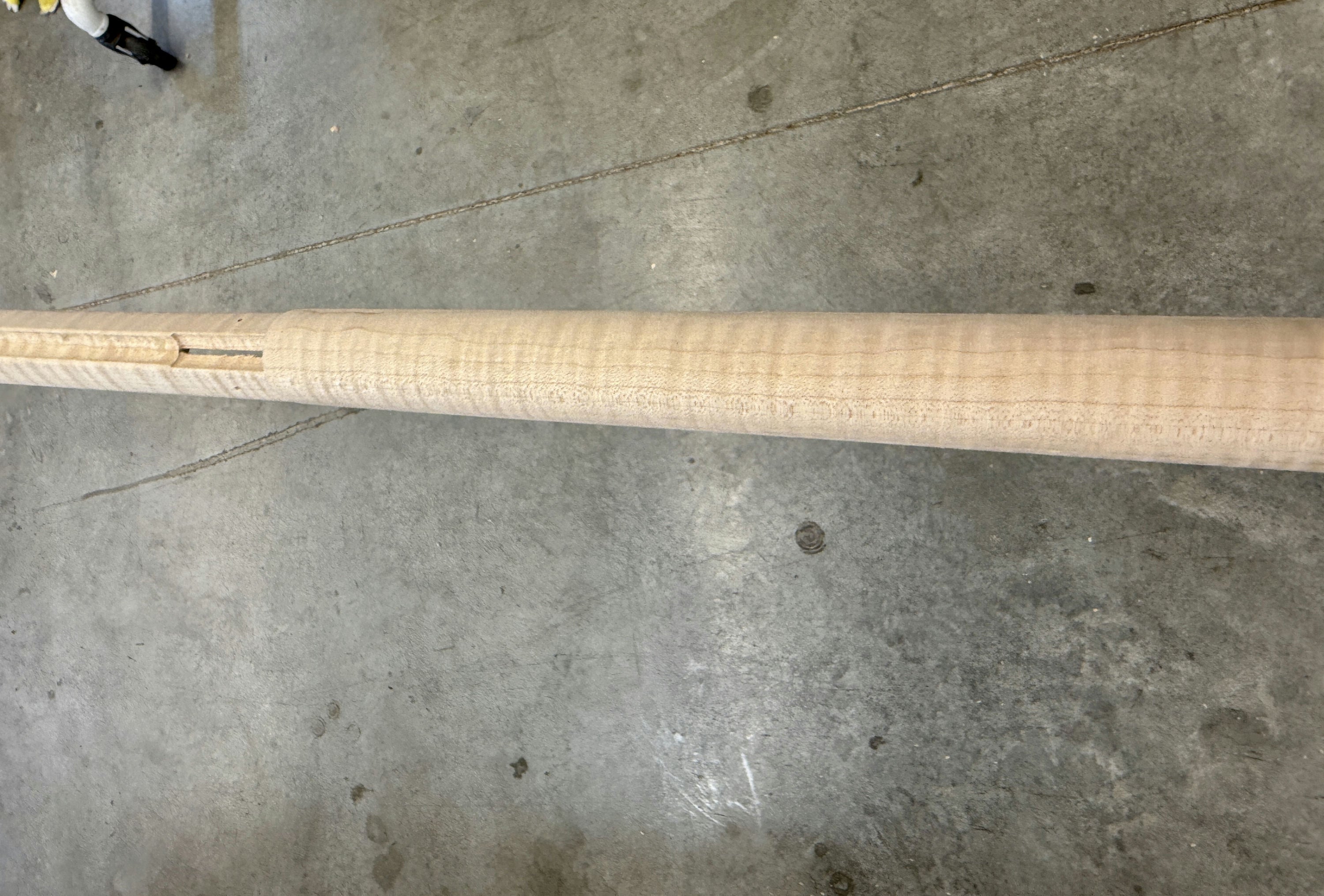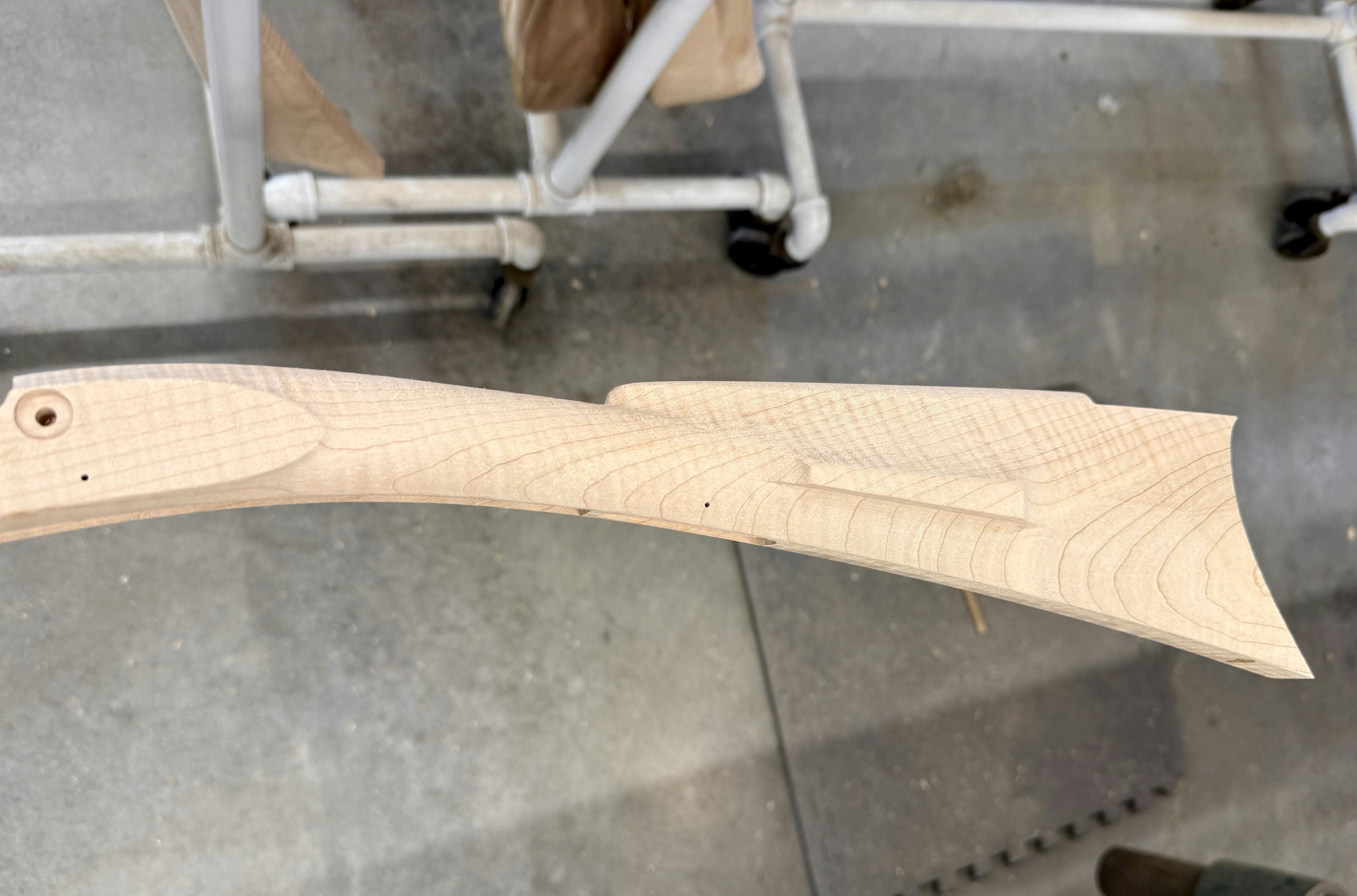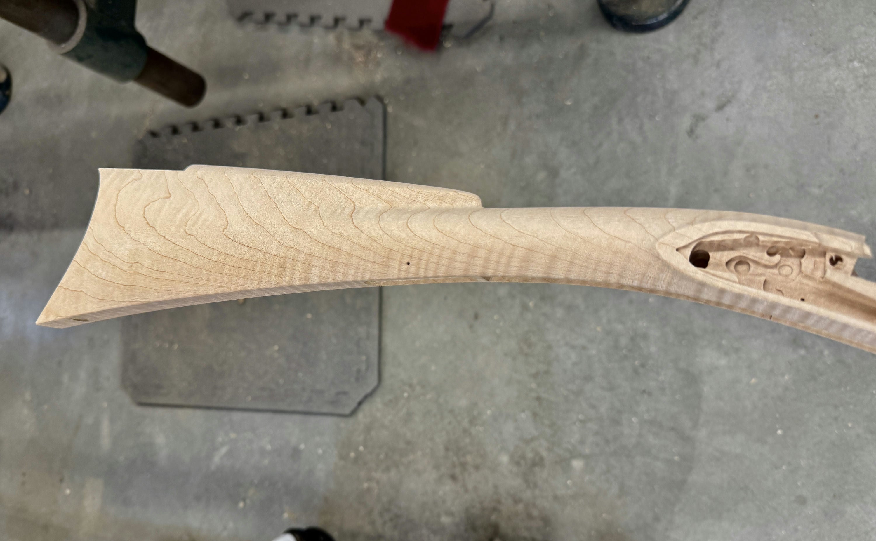 Extra fancy maple stock with a worm stain and filled hole on the forestock and a small stain on the toe line.