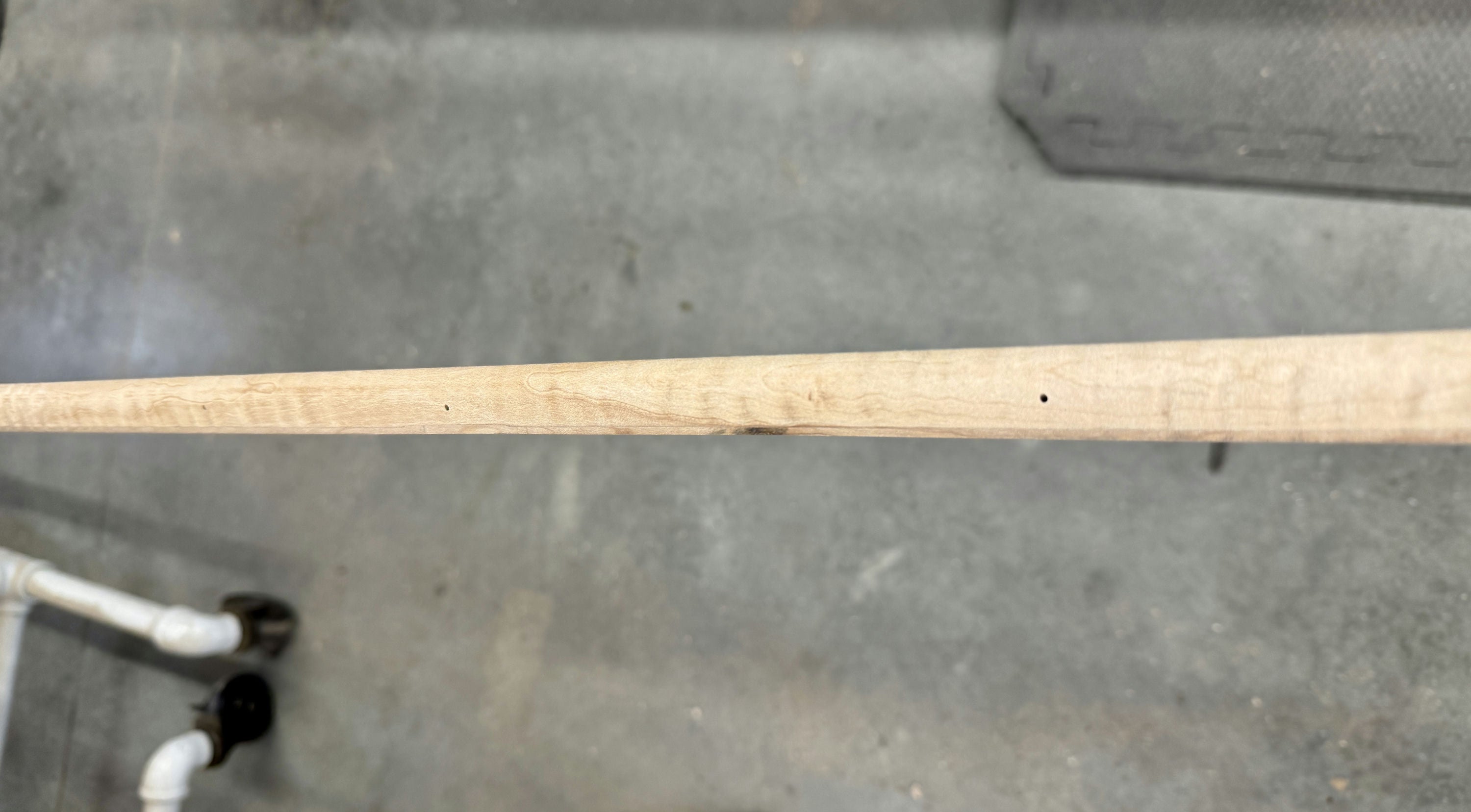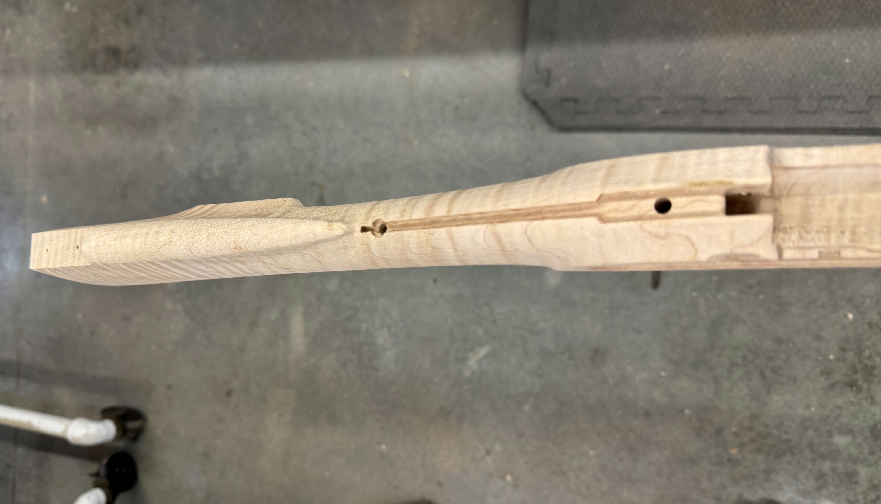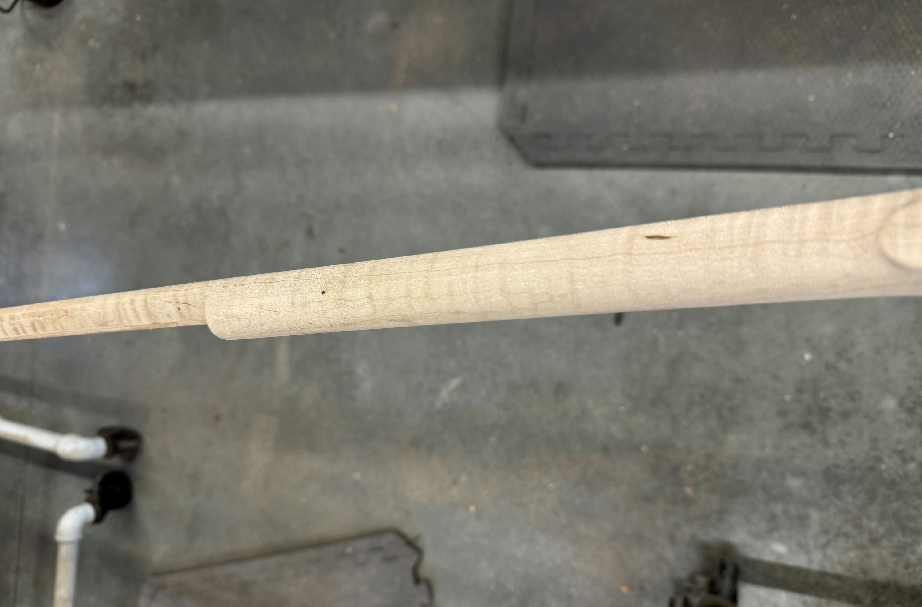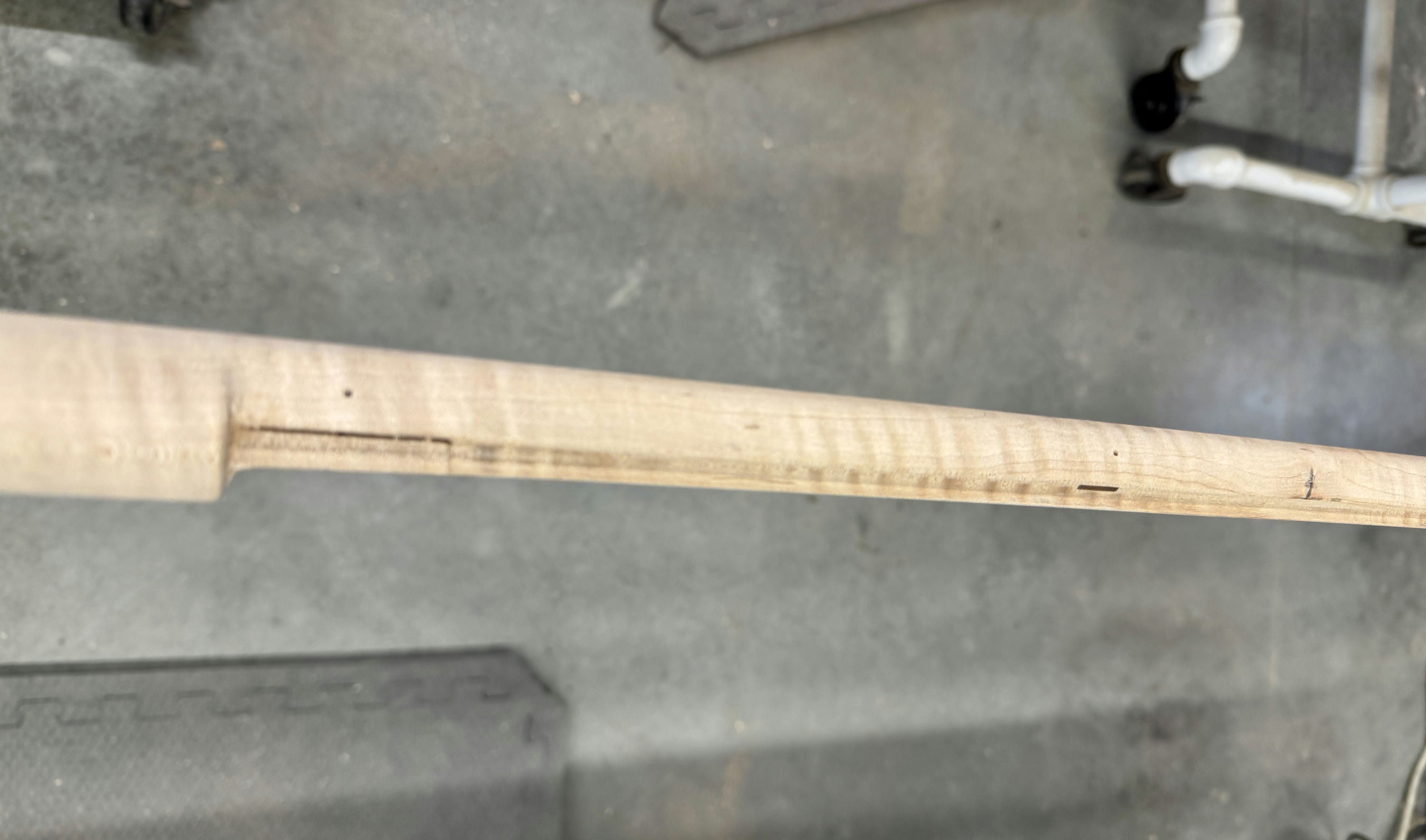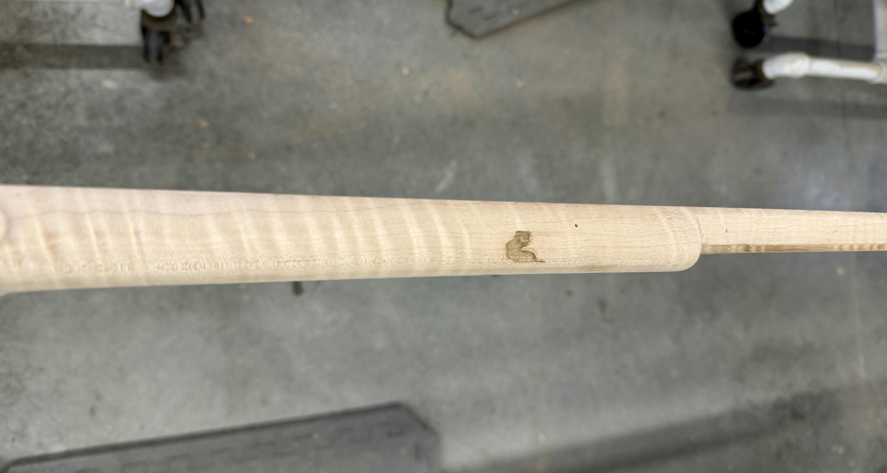 Fancy maple stock with a stain on the fore stock and a small filled inclusion.