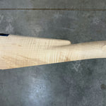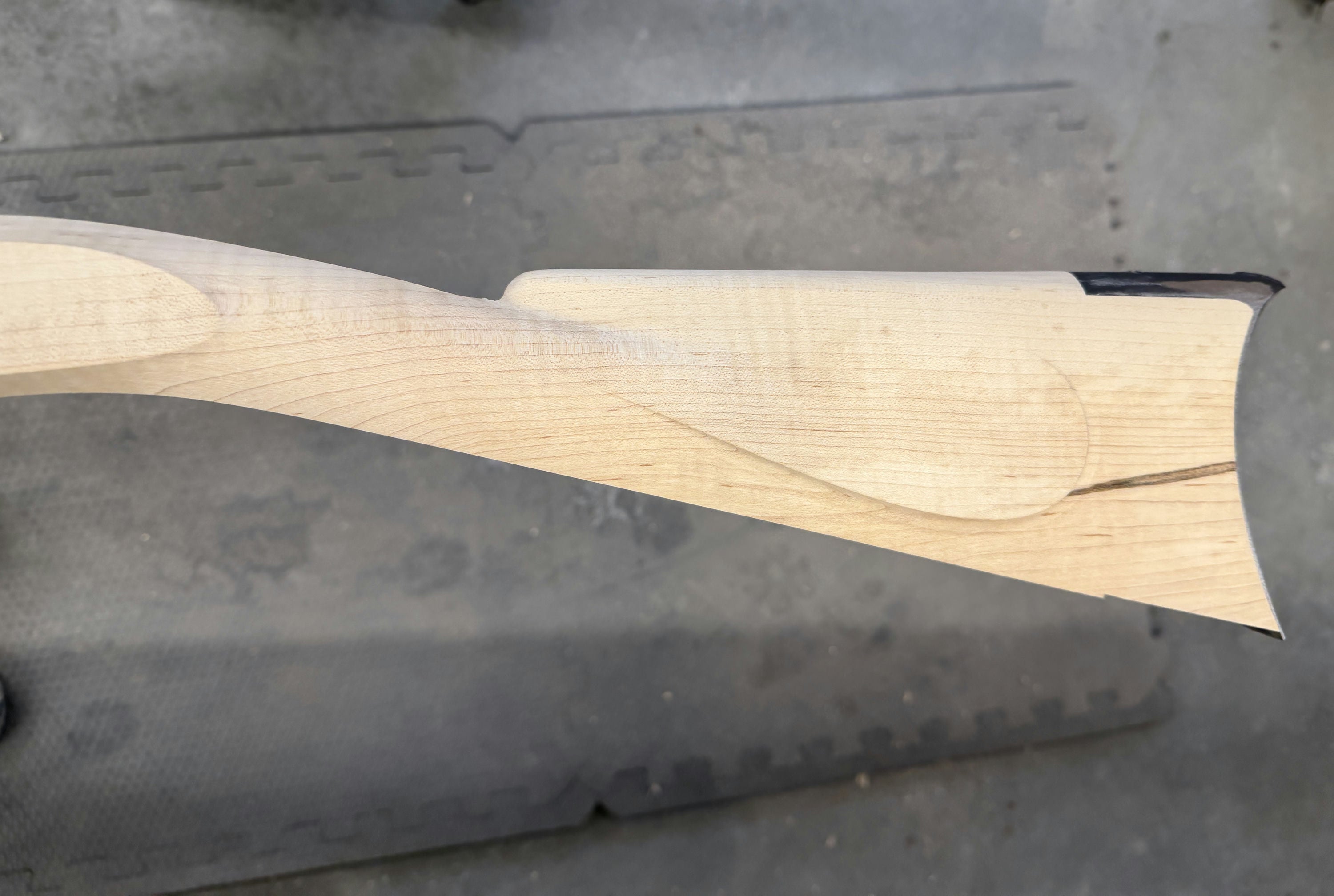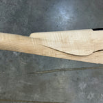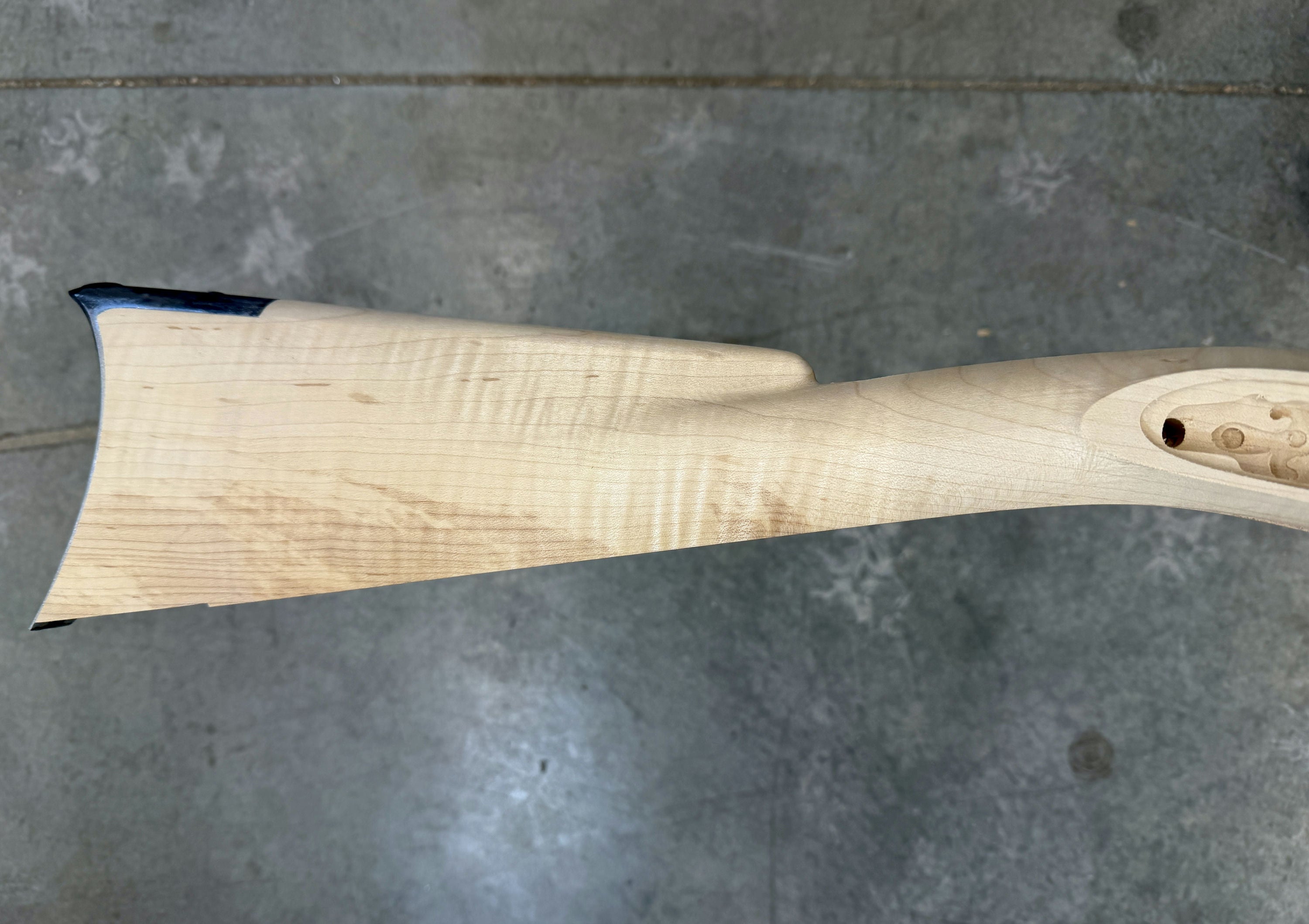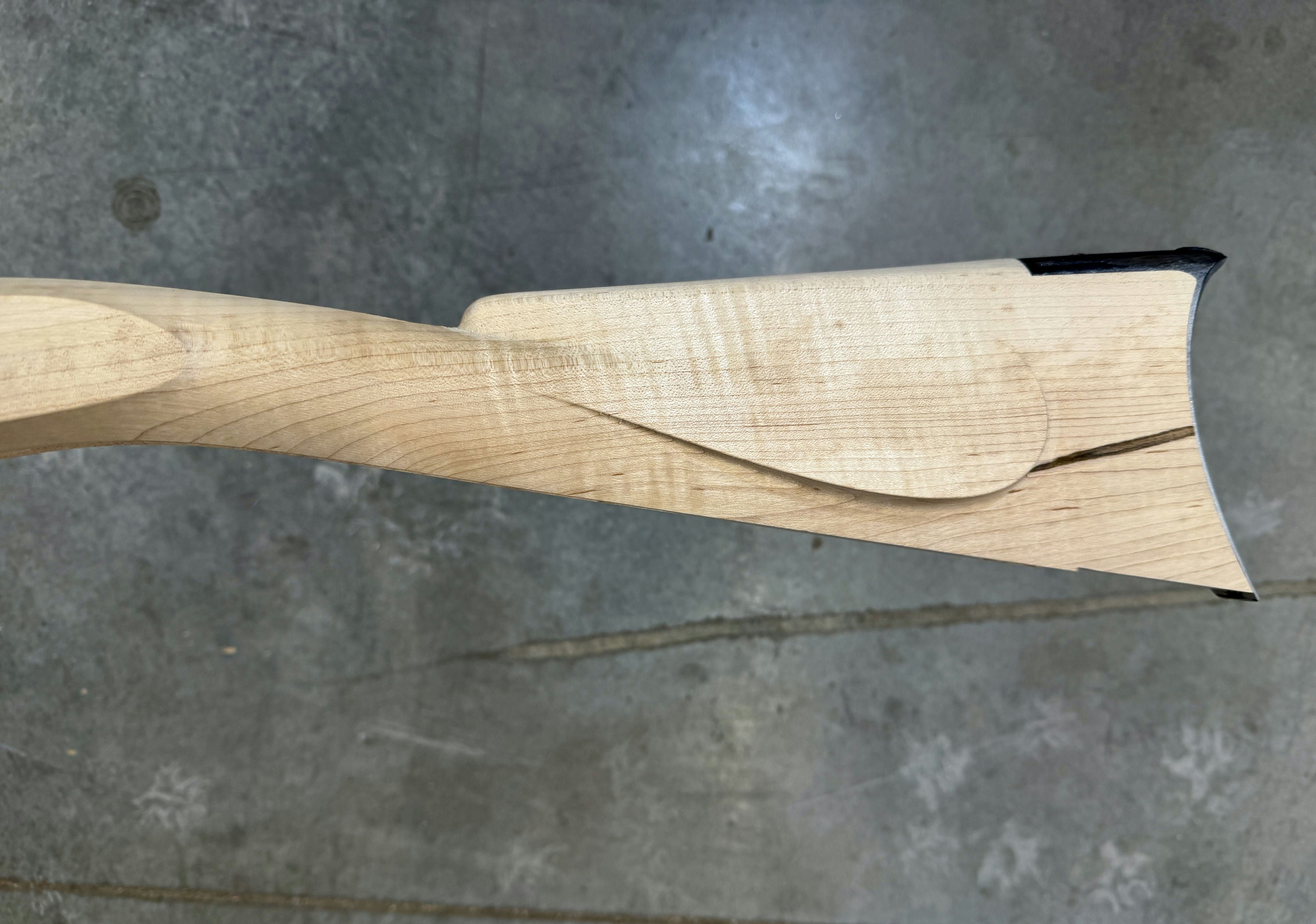 Fancy sugar maple stock with a dark stain on the cheek.