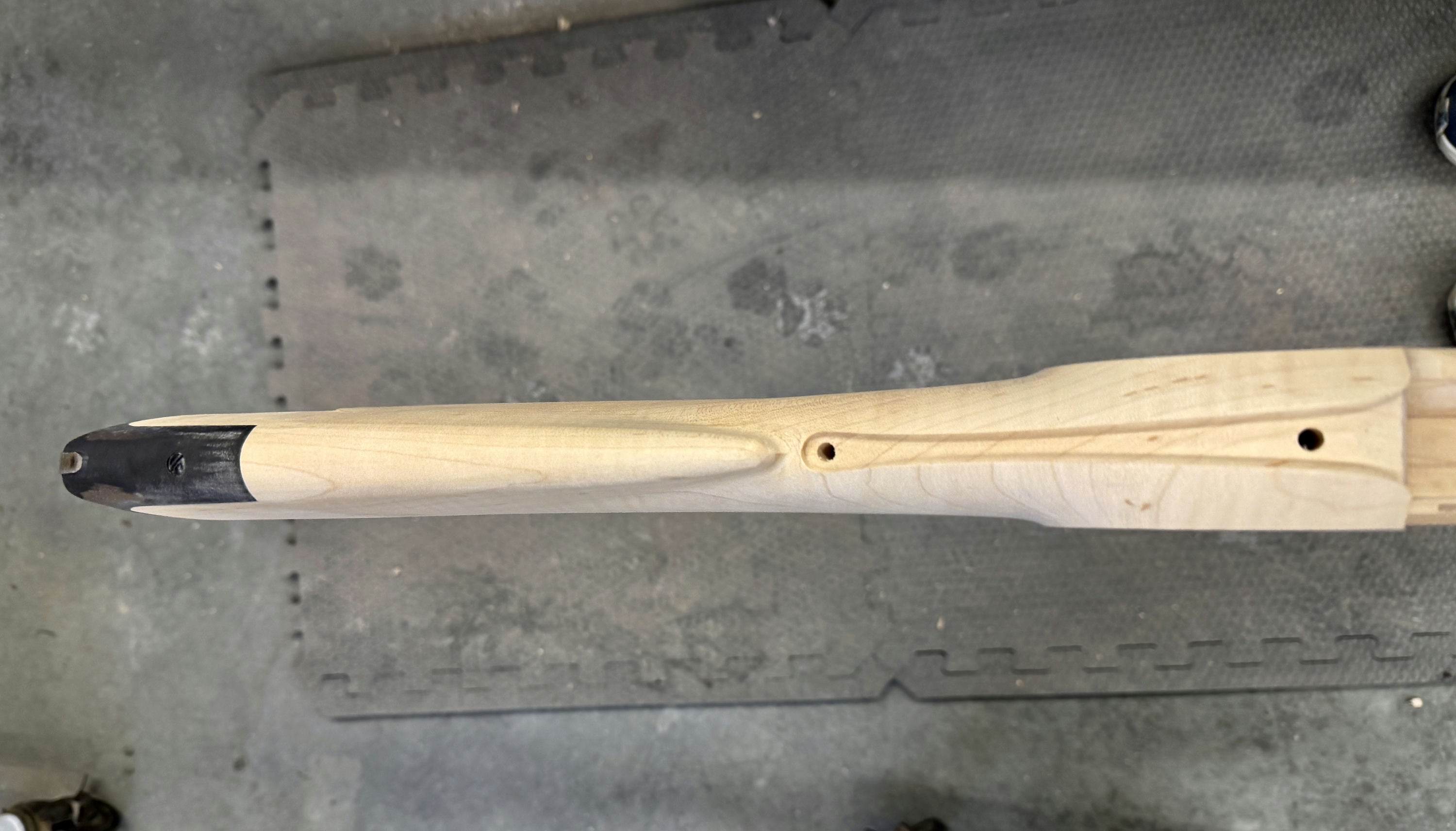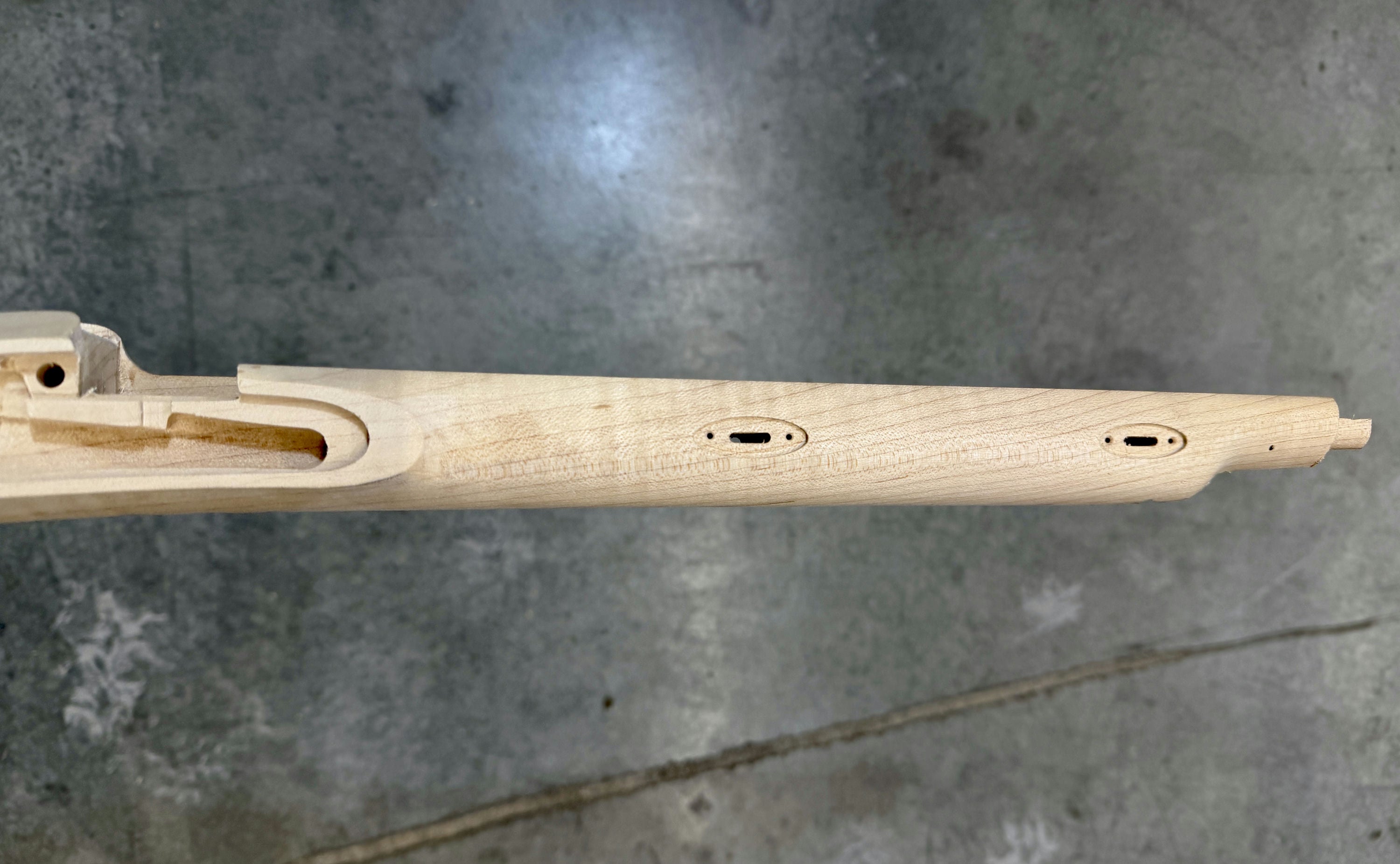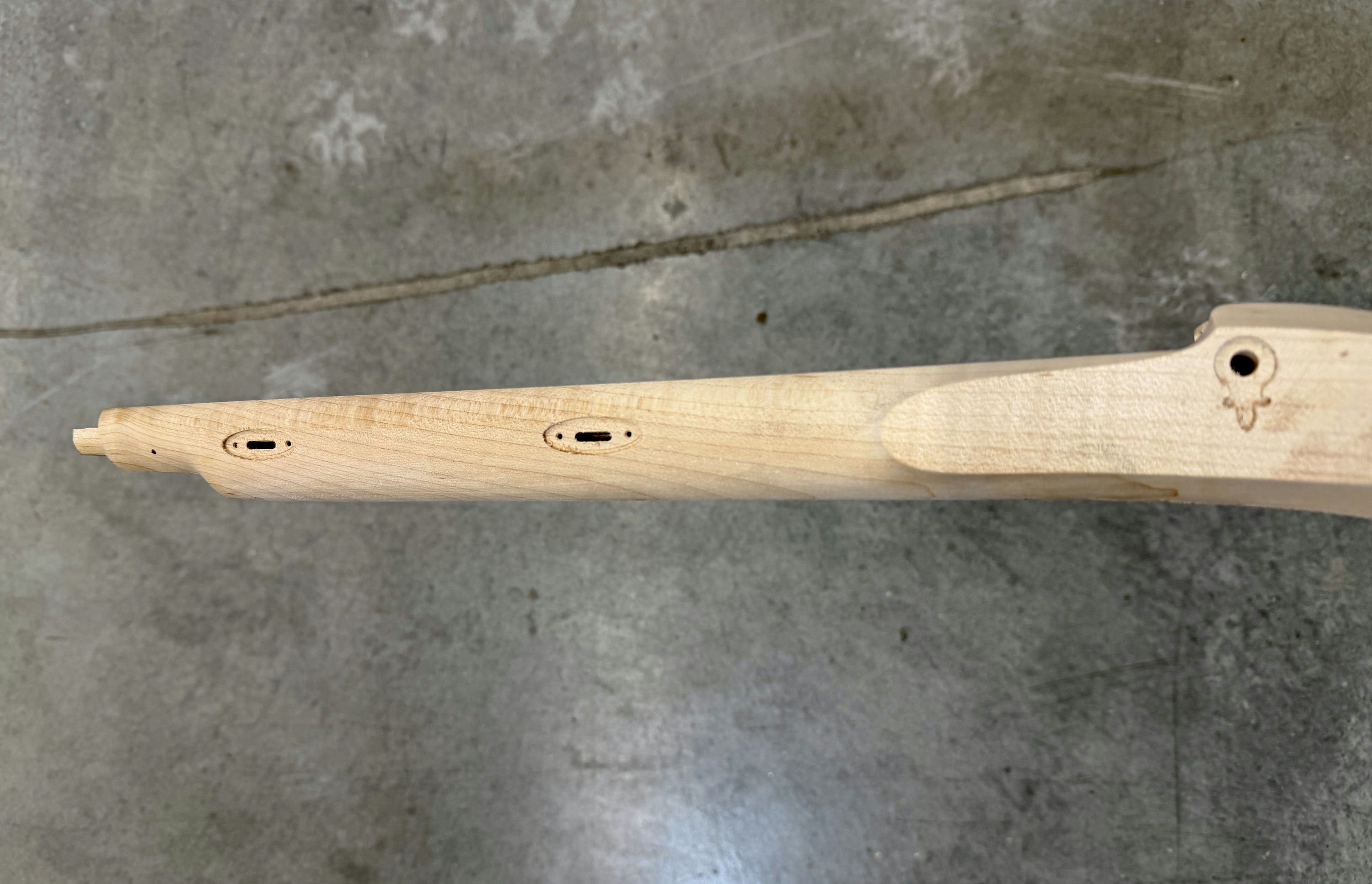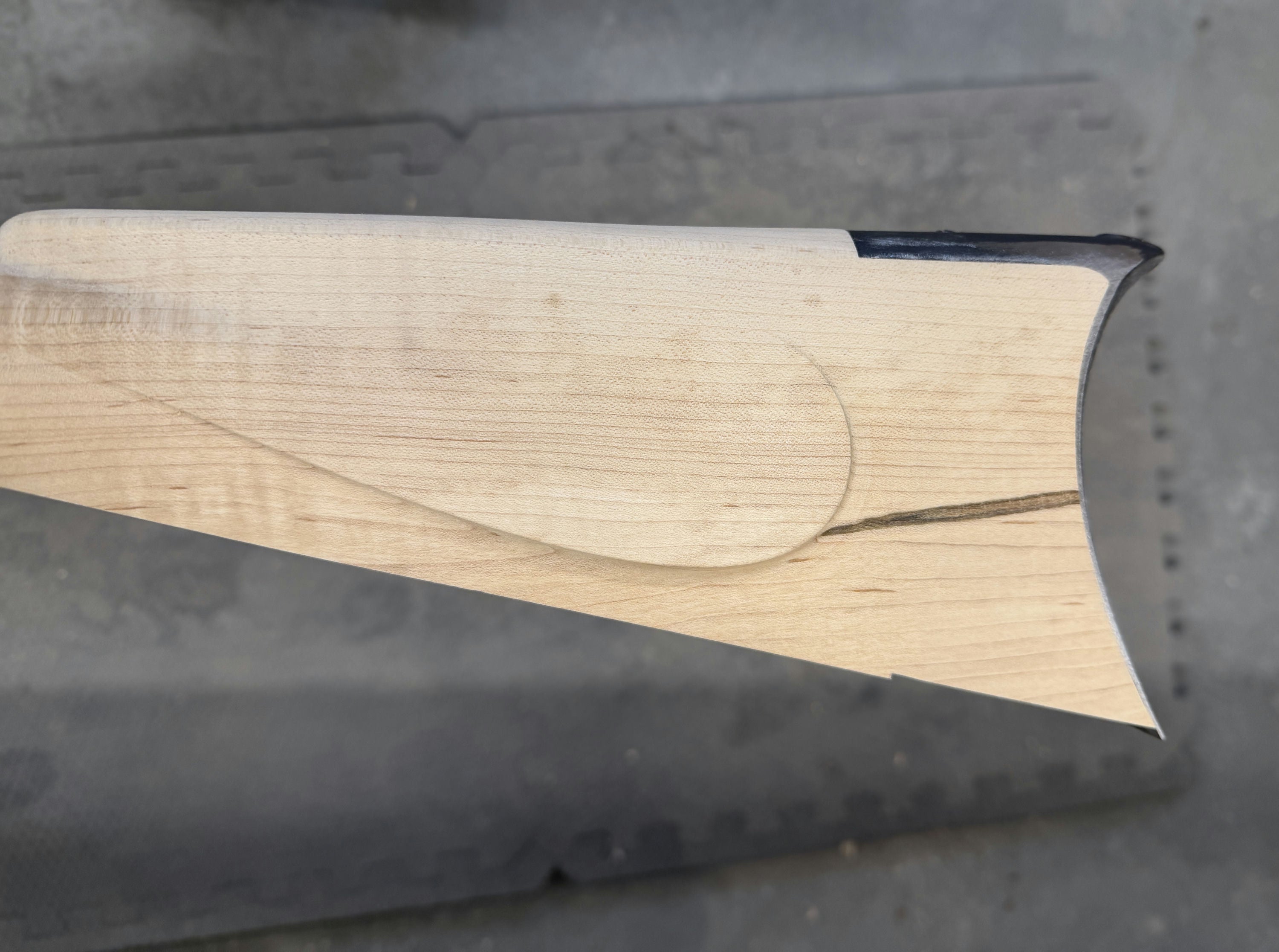 Fancy sugar maple stock with a dark stain on the cheek.