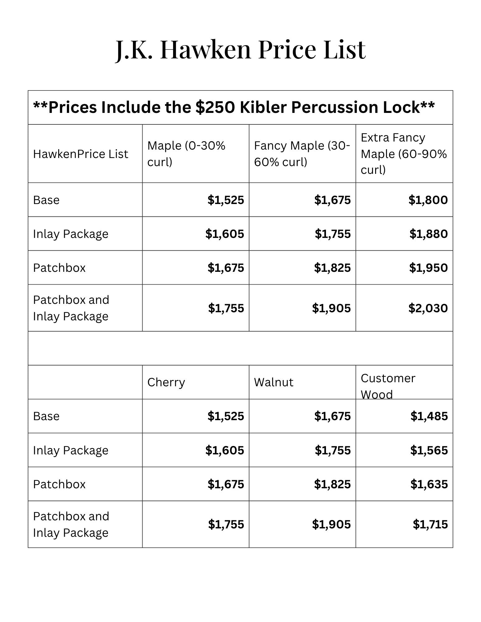 | **Prices Below Include the $250 Kibler Percussion Lock** | |||