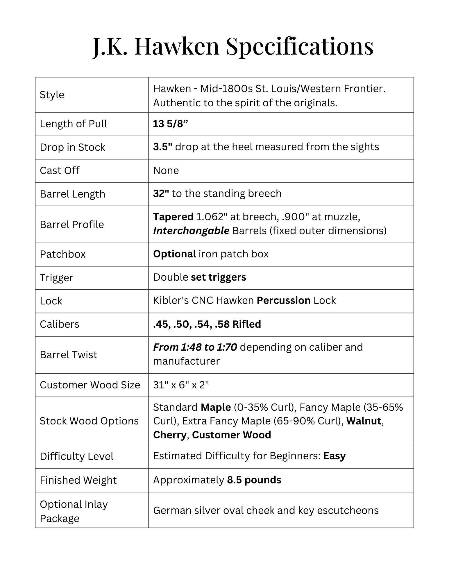 | Style | Hawken - Mid-1800s St. Louis/Western Frontier. Authentic to the spirit of the originals. |