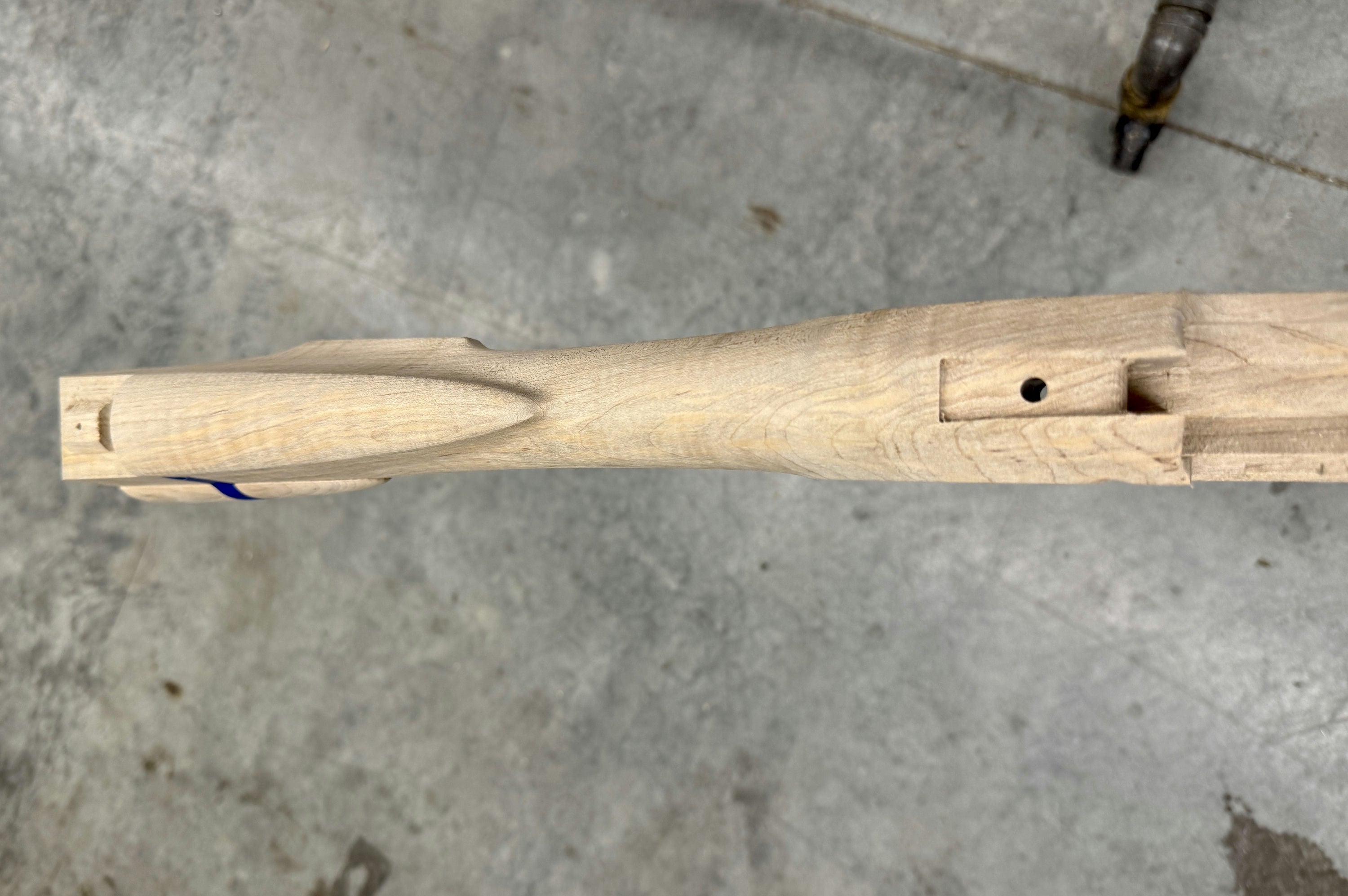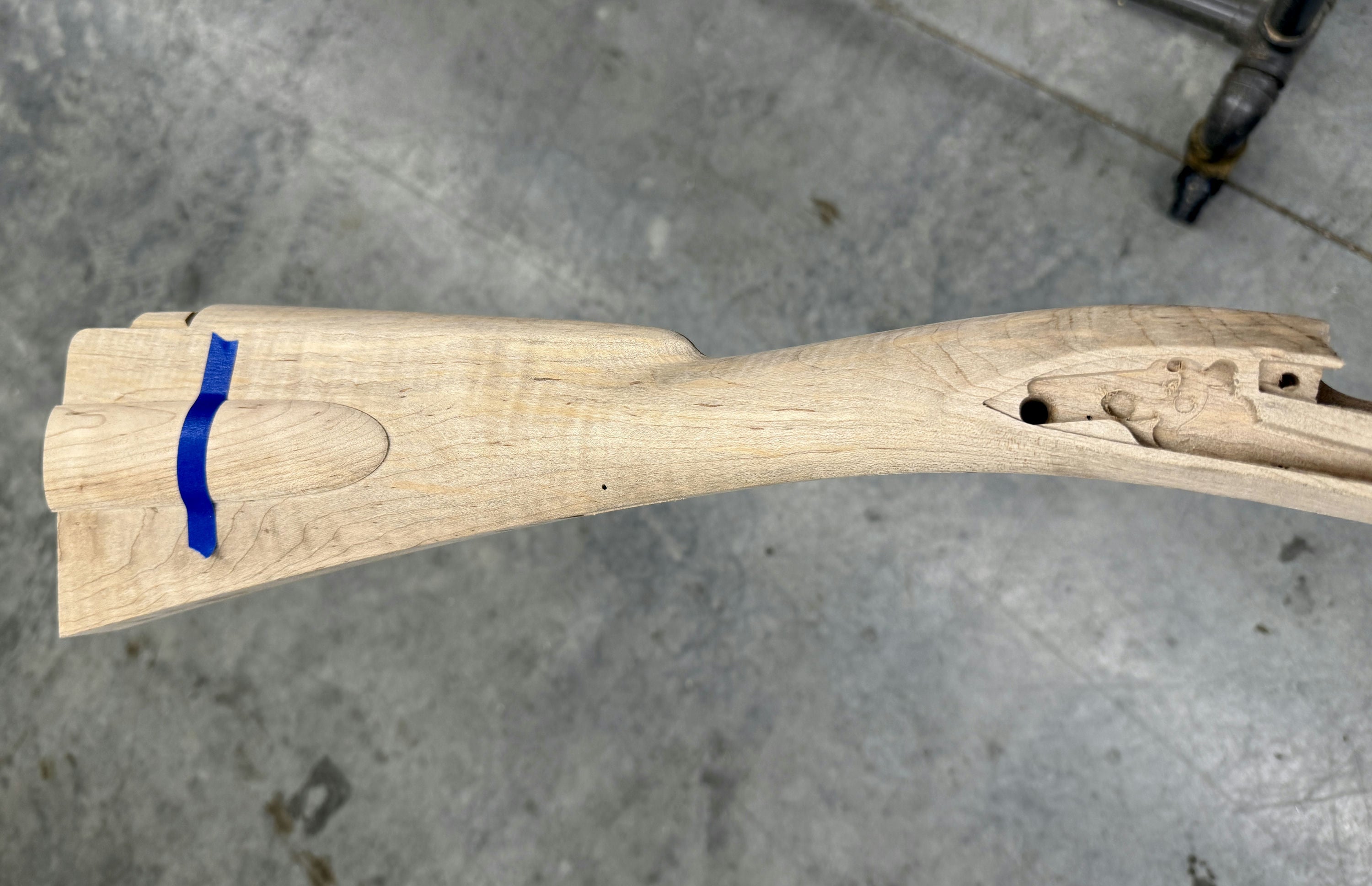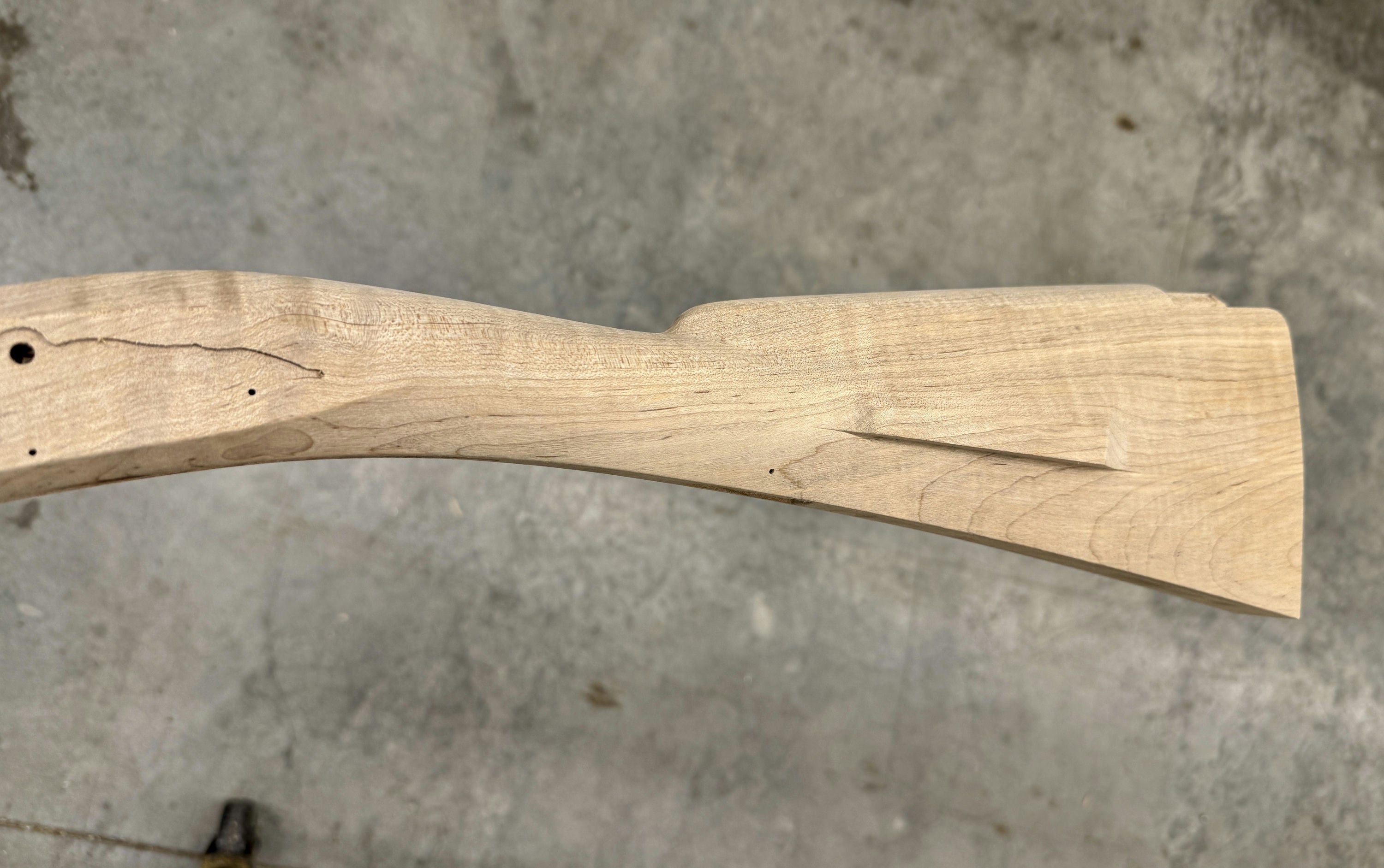 Standard maple stock with a very small stain by the trigger plate inlet and some discoloration in the stock - shouldn't show much once finished. Has patch box.