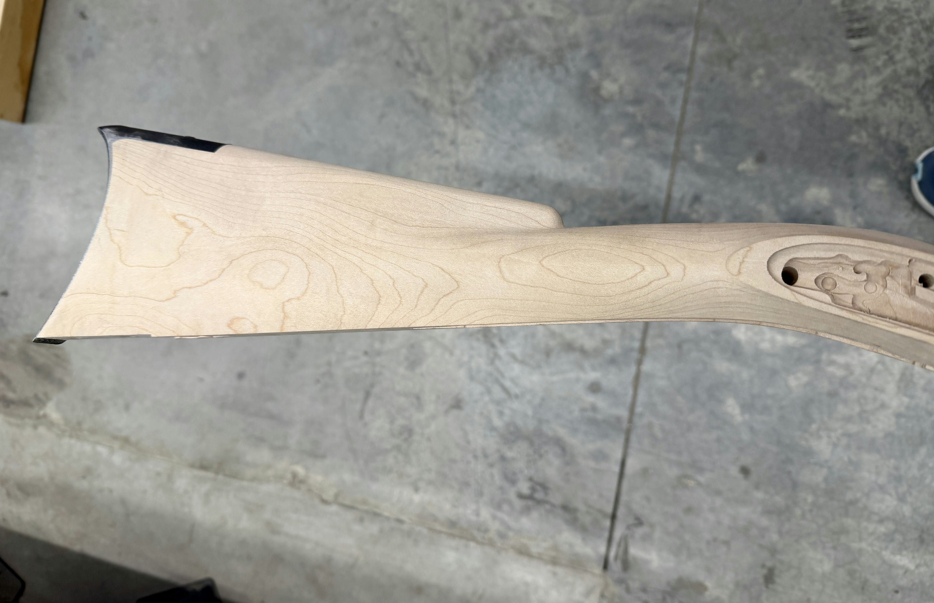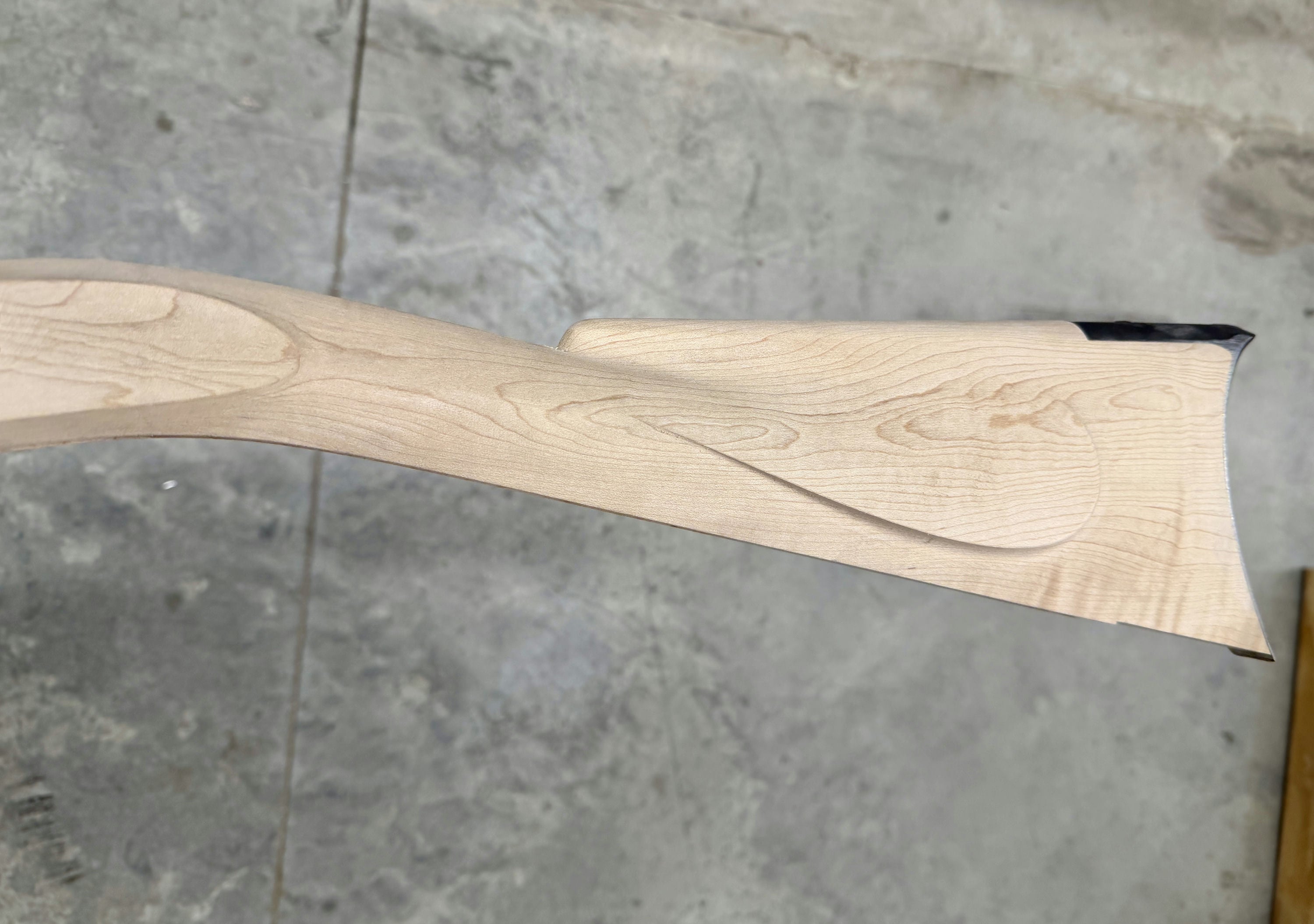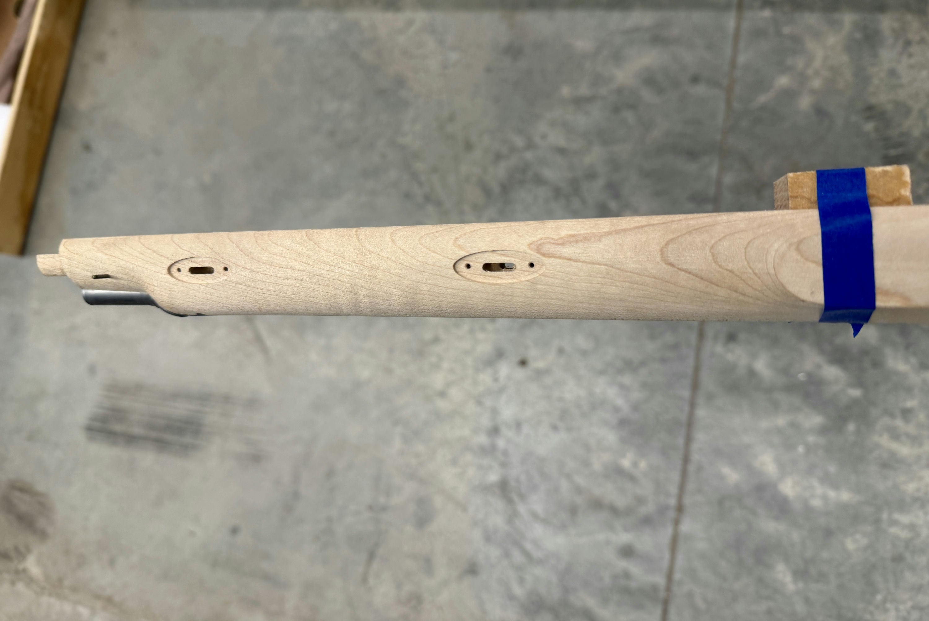 Standard maple stock with two small chips by the entry pipe - wood included for repair.
