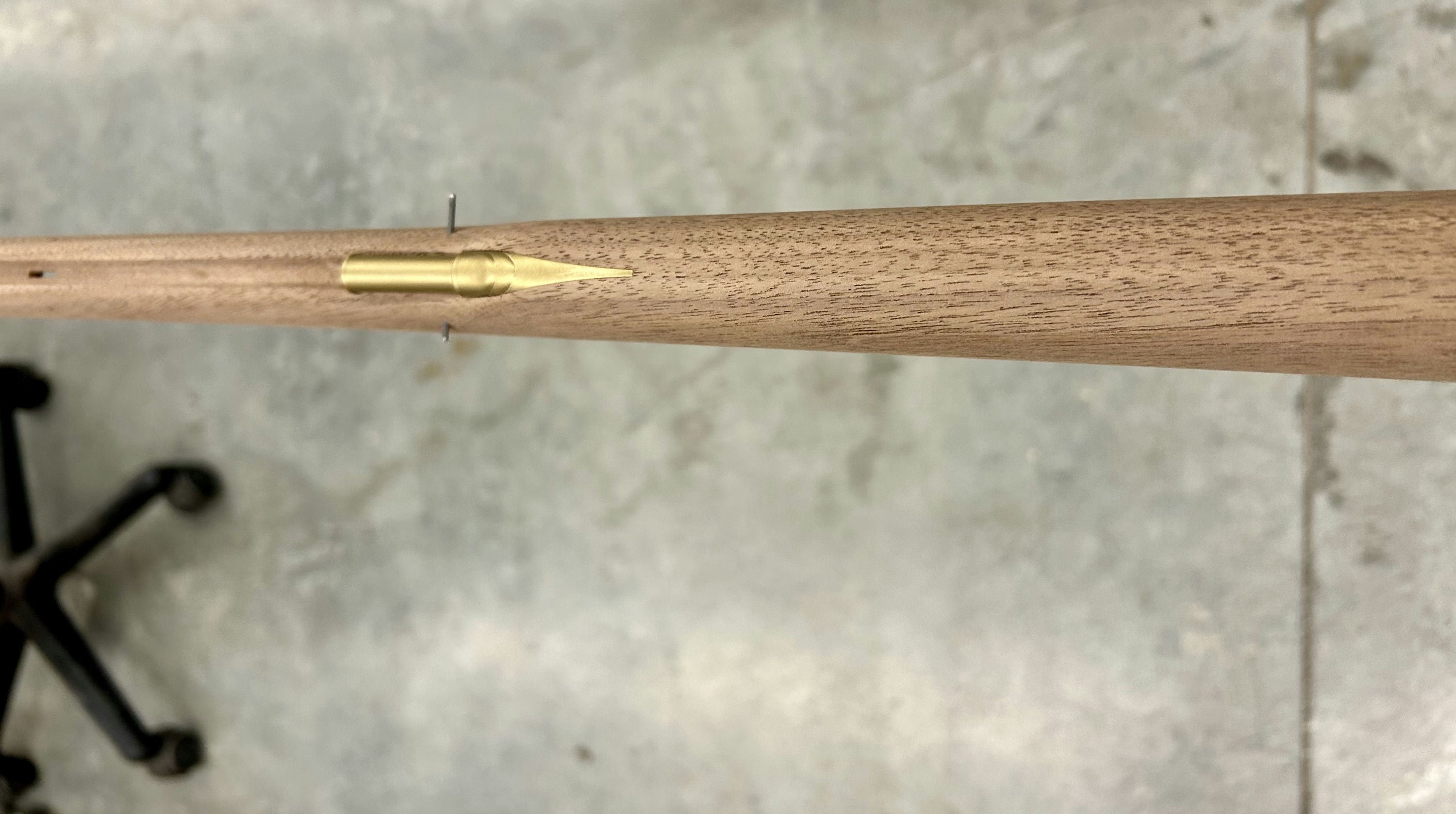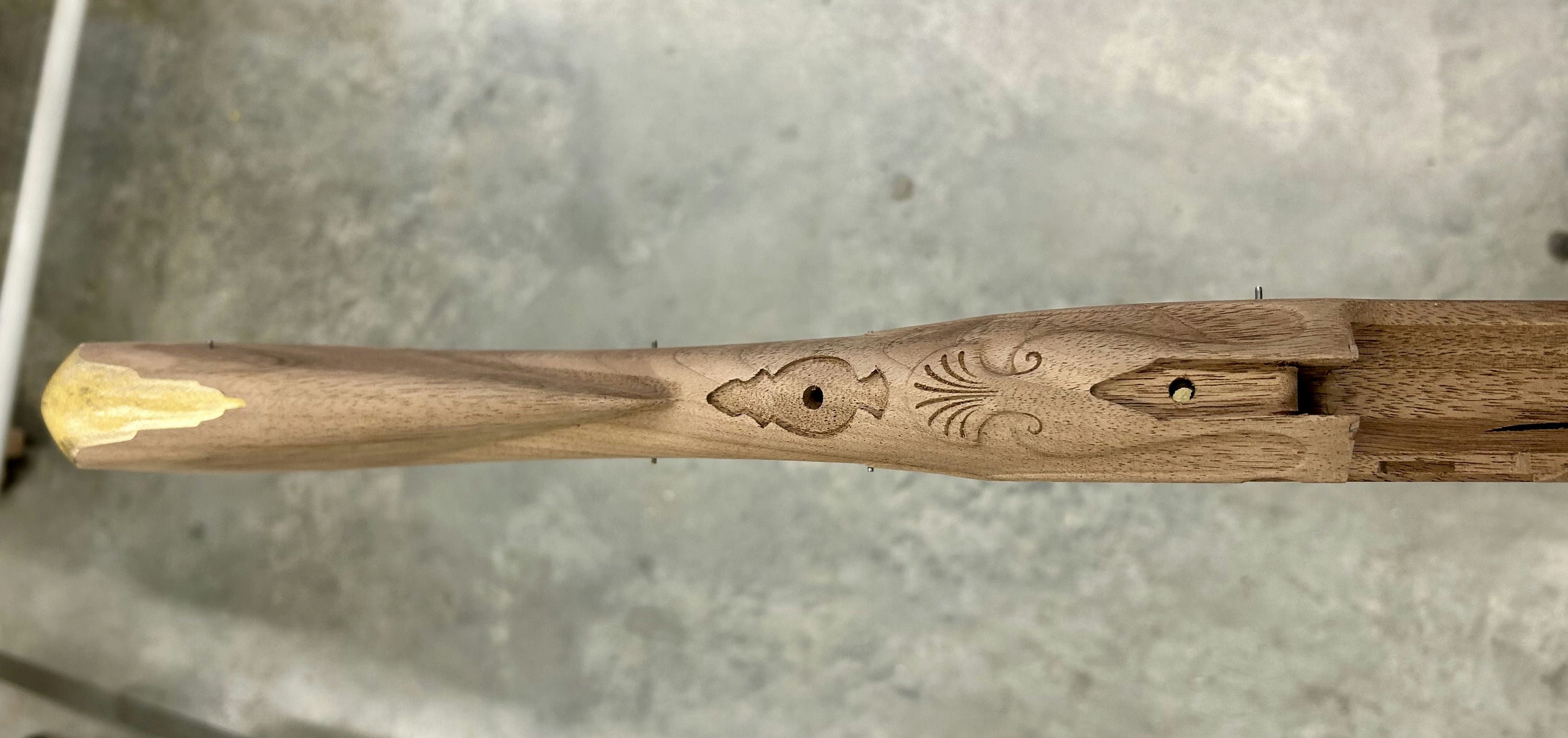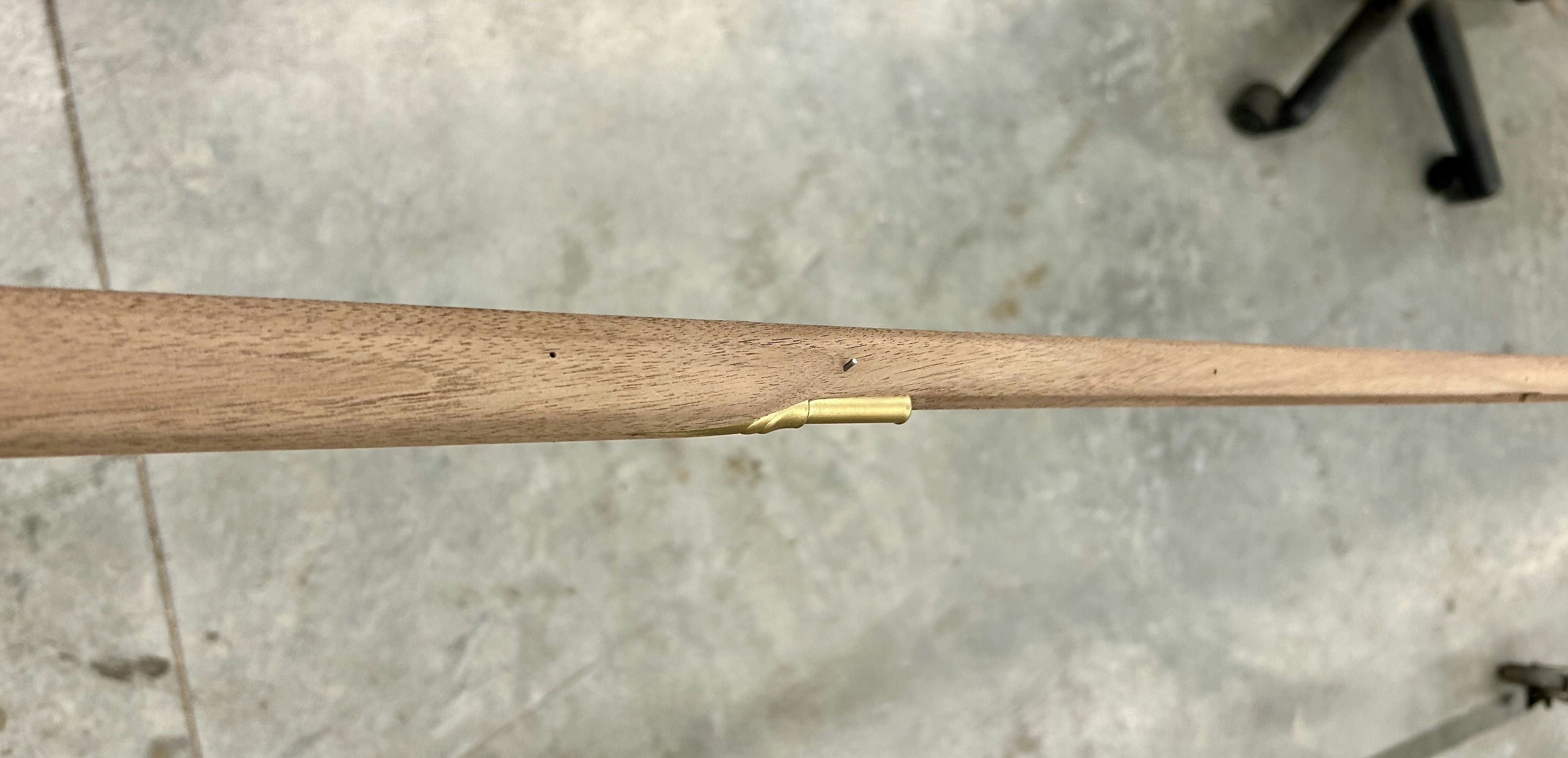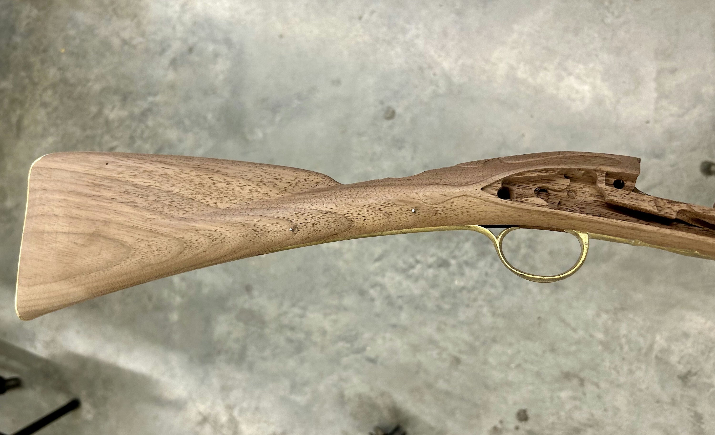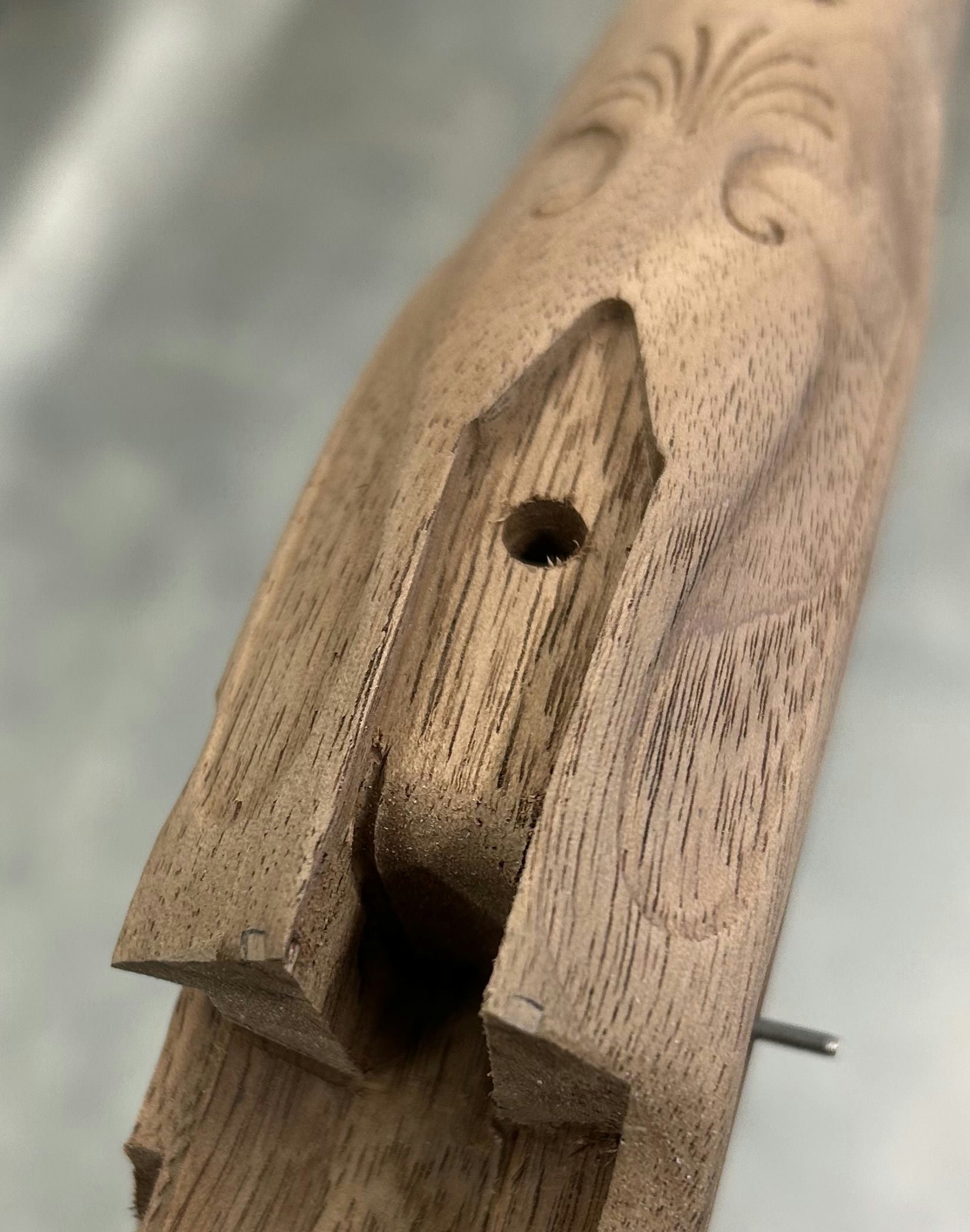 Walnut stock with cuts in the tang inlet that have been repaired.