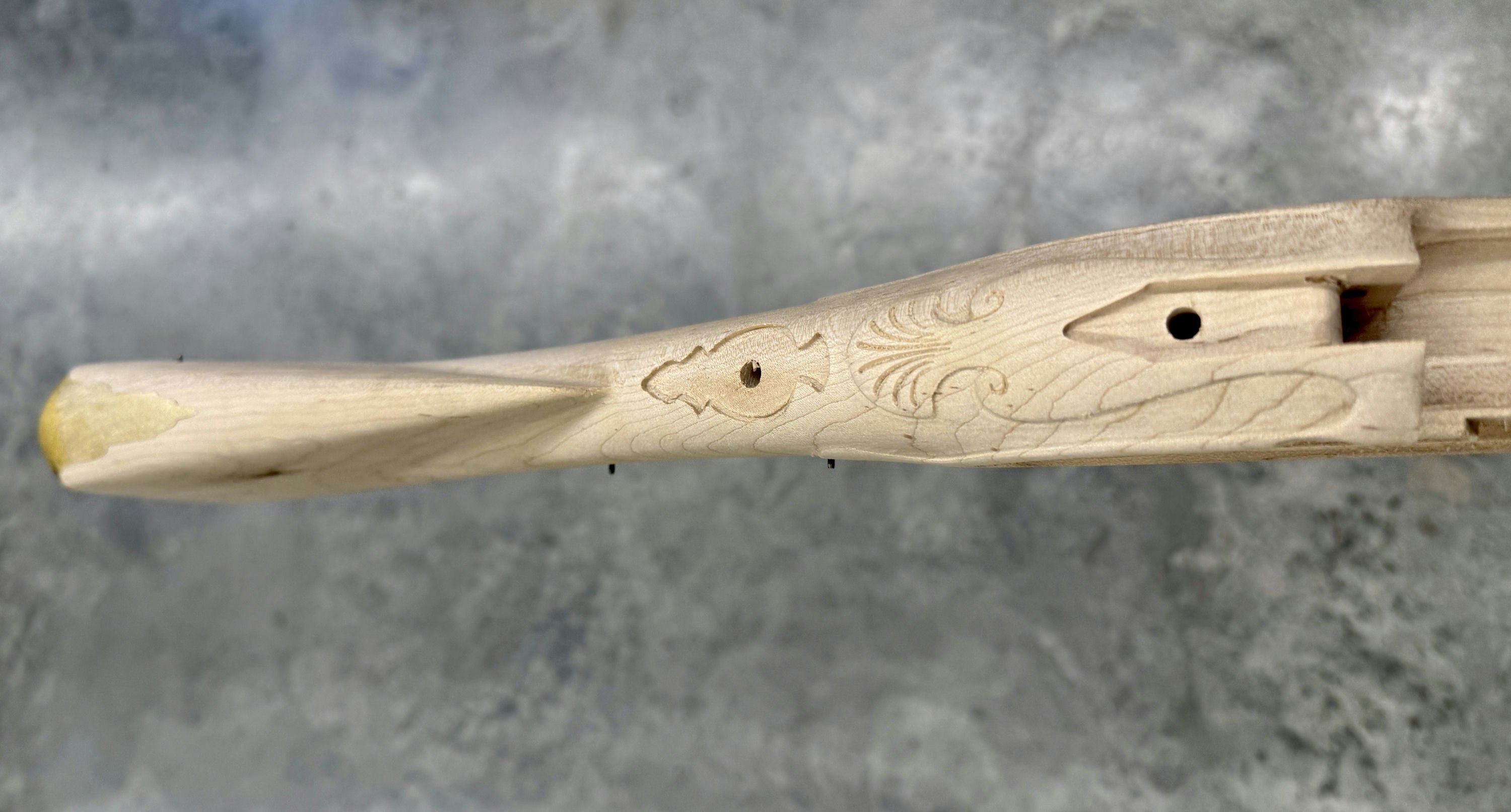 • CNC machined stock for extremely close tolerances and fine surface finish, embellished with a relief shell carving around the tang, as well as relief lock moldings and beaver tails.