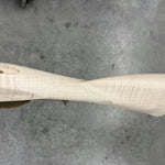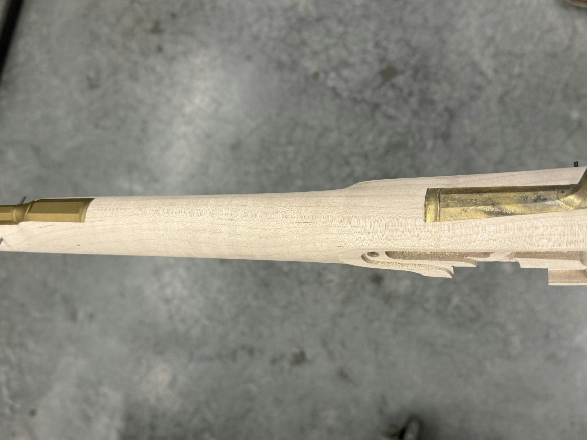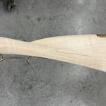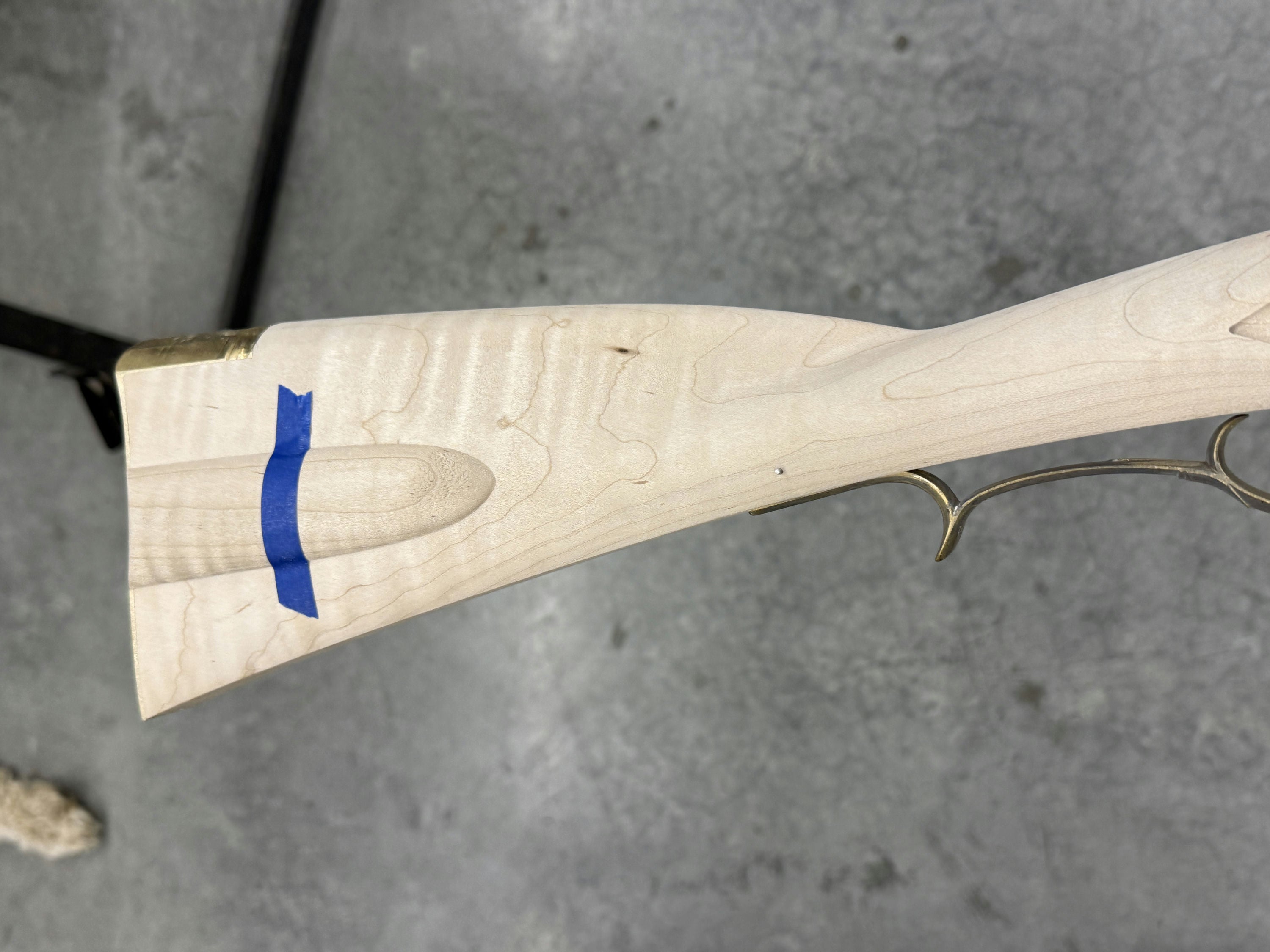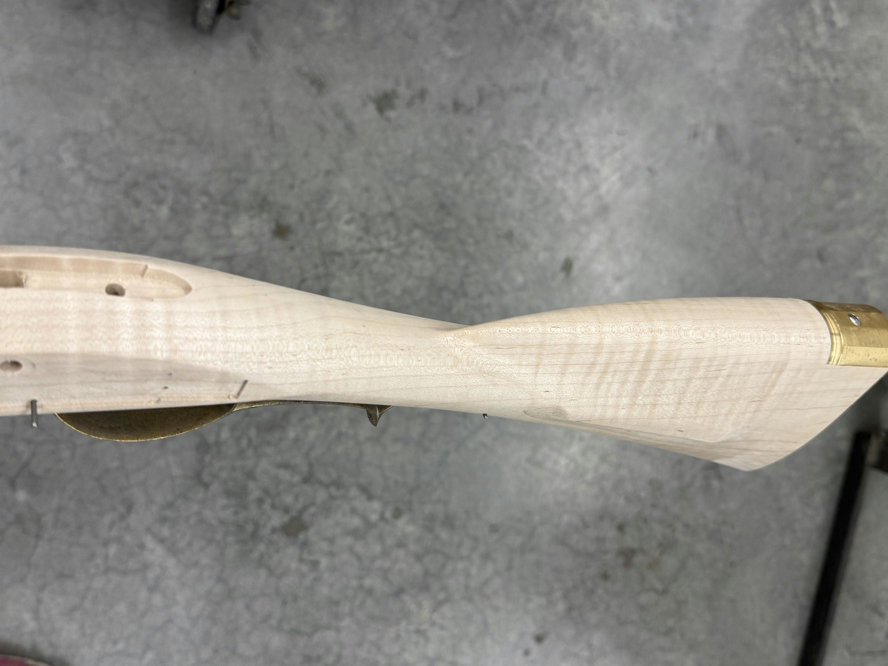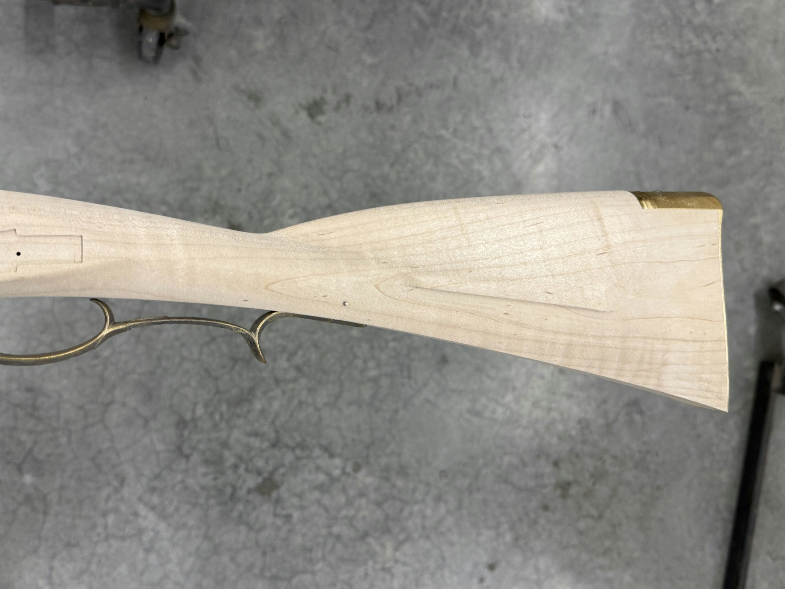 Stock between standard and fancy maple with a very small spot on the cheek but not an issue.