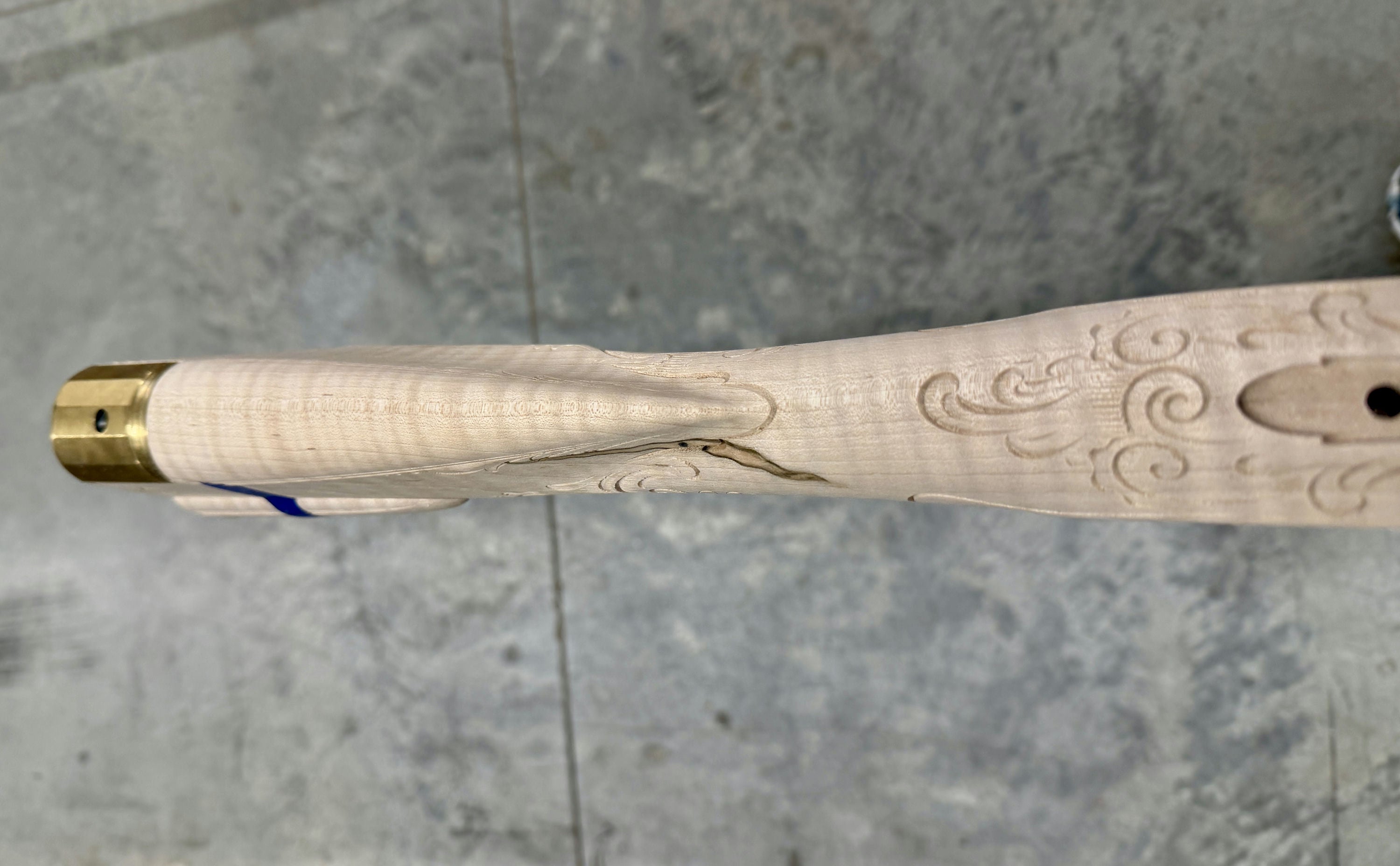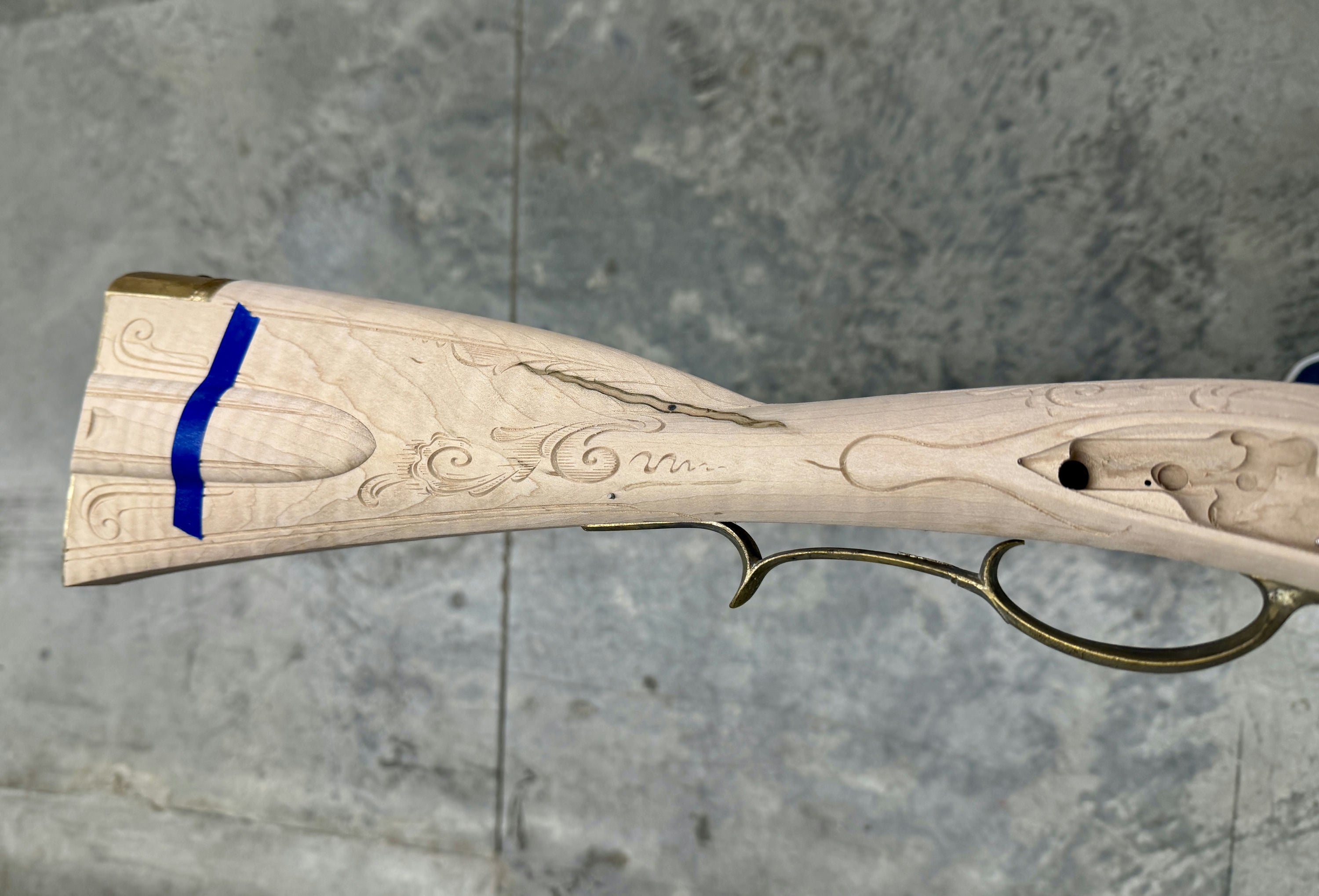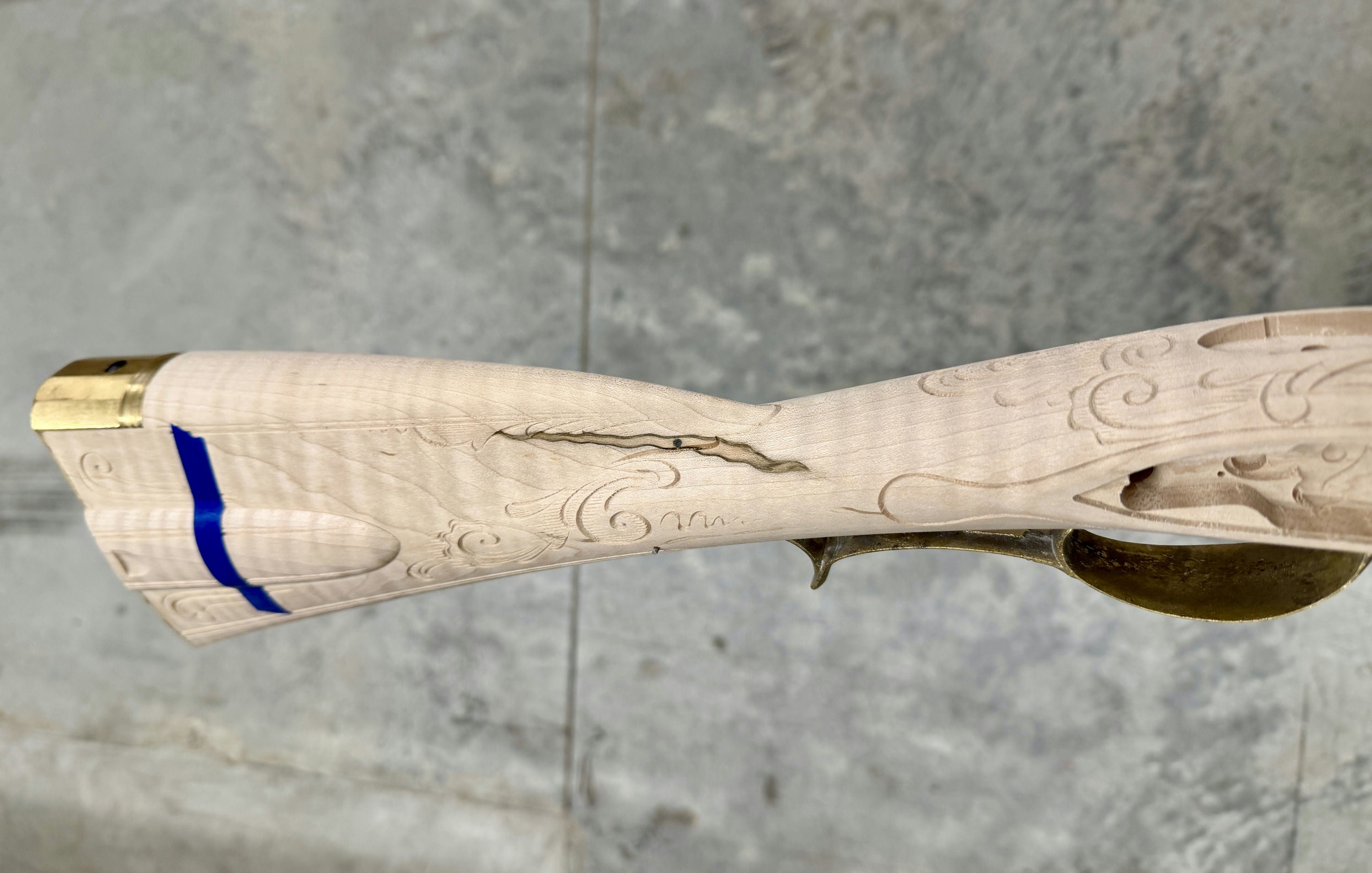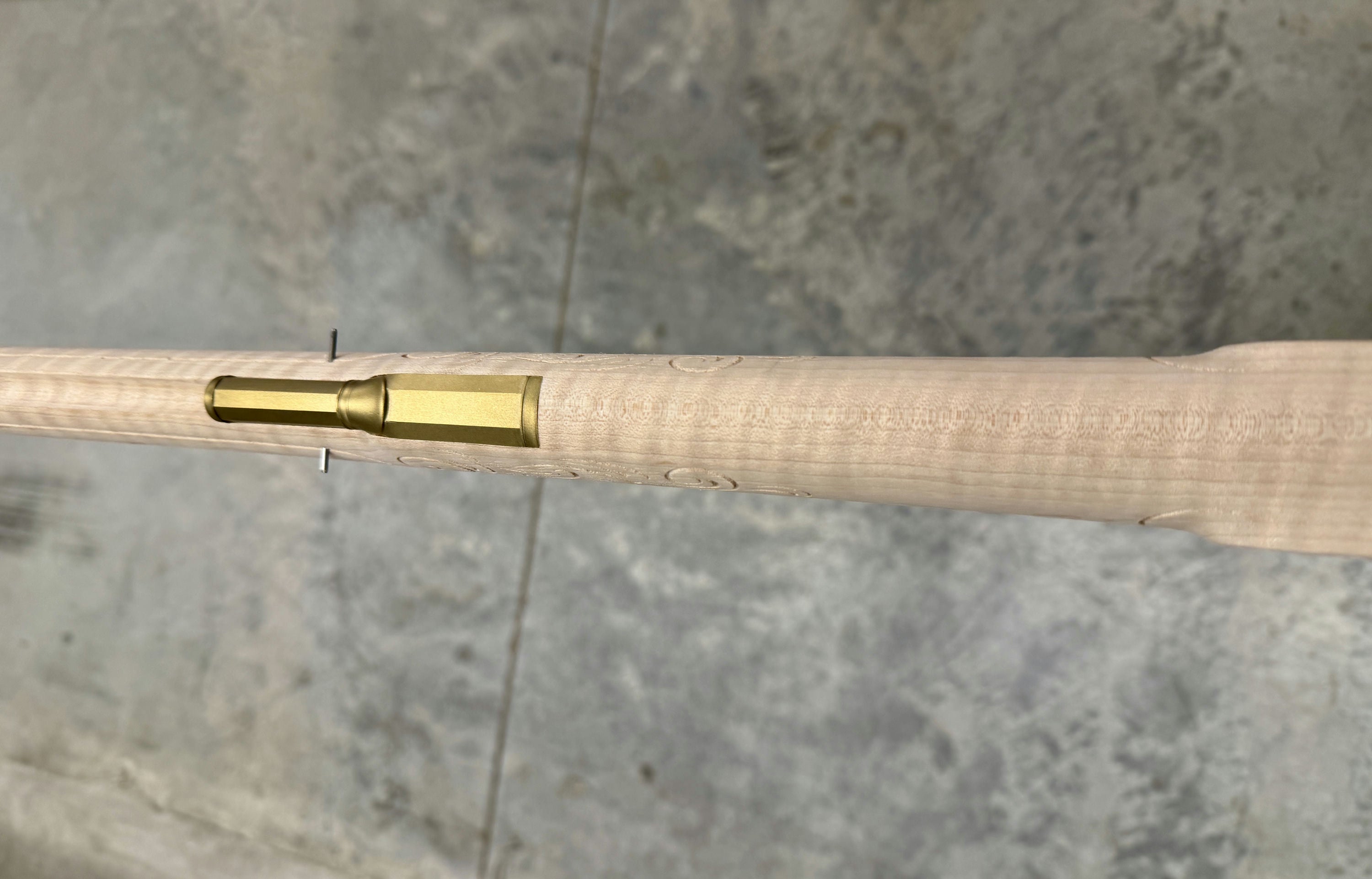 Fancy maple stock with a filled worm hole and stain.