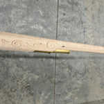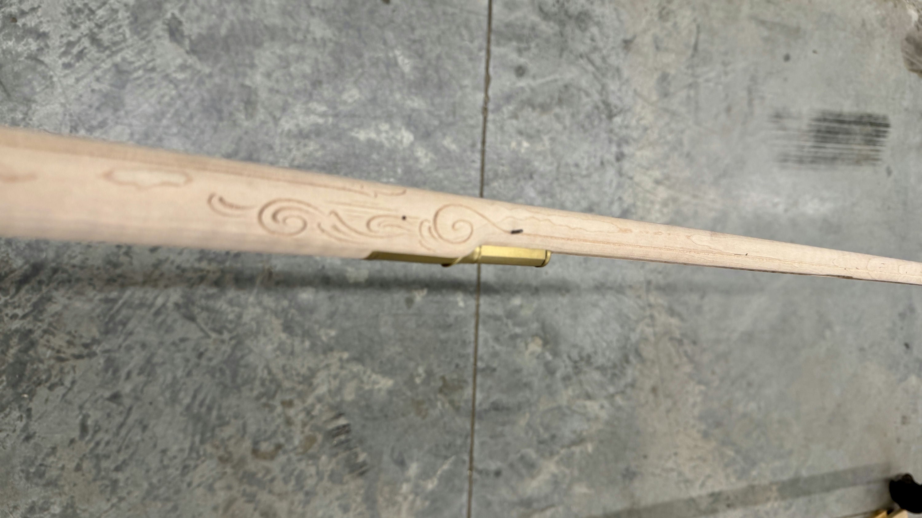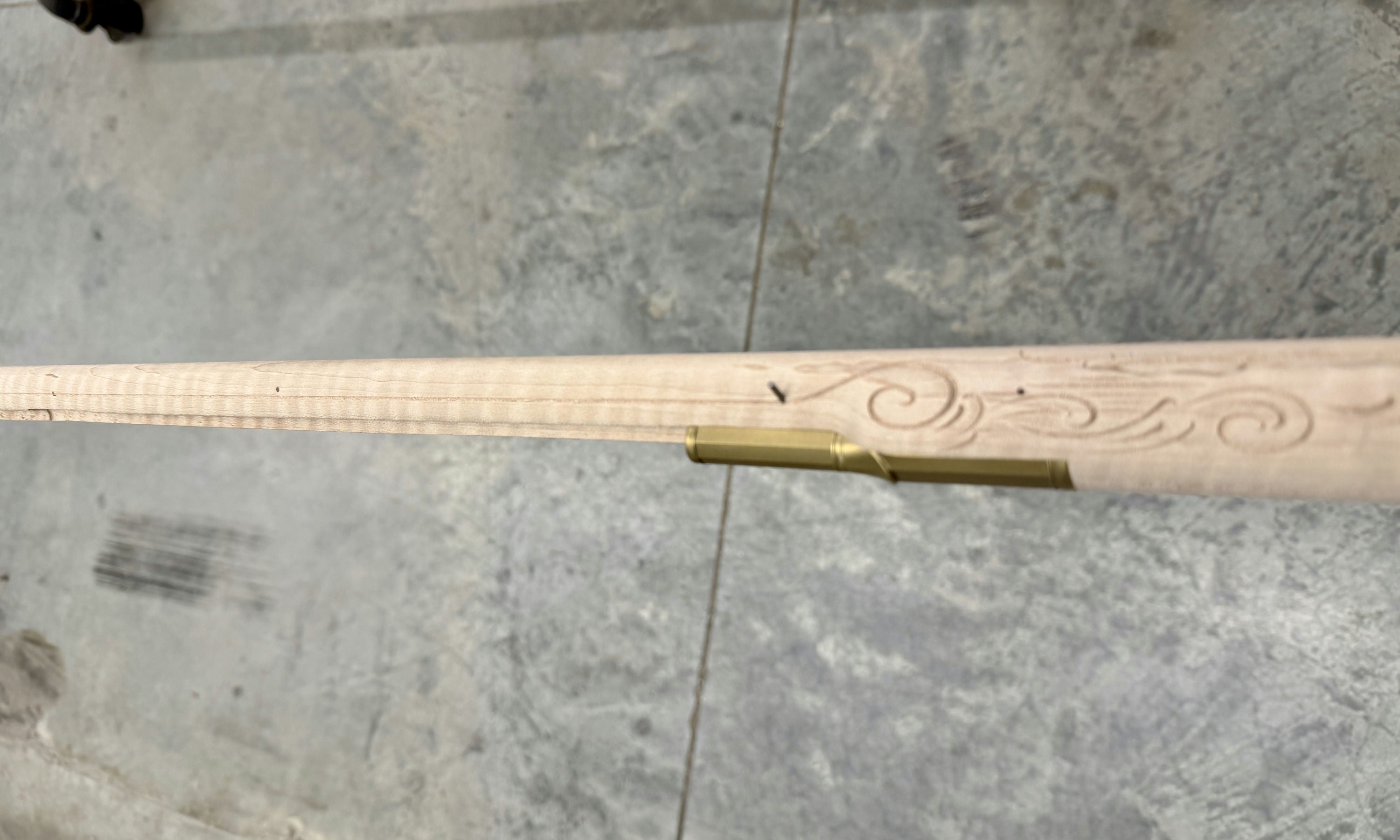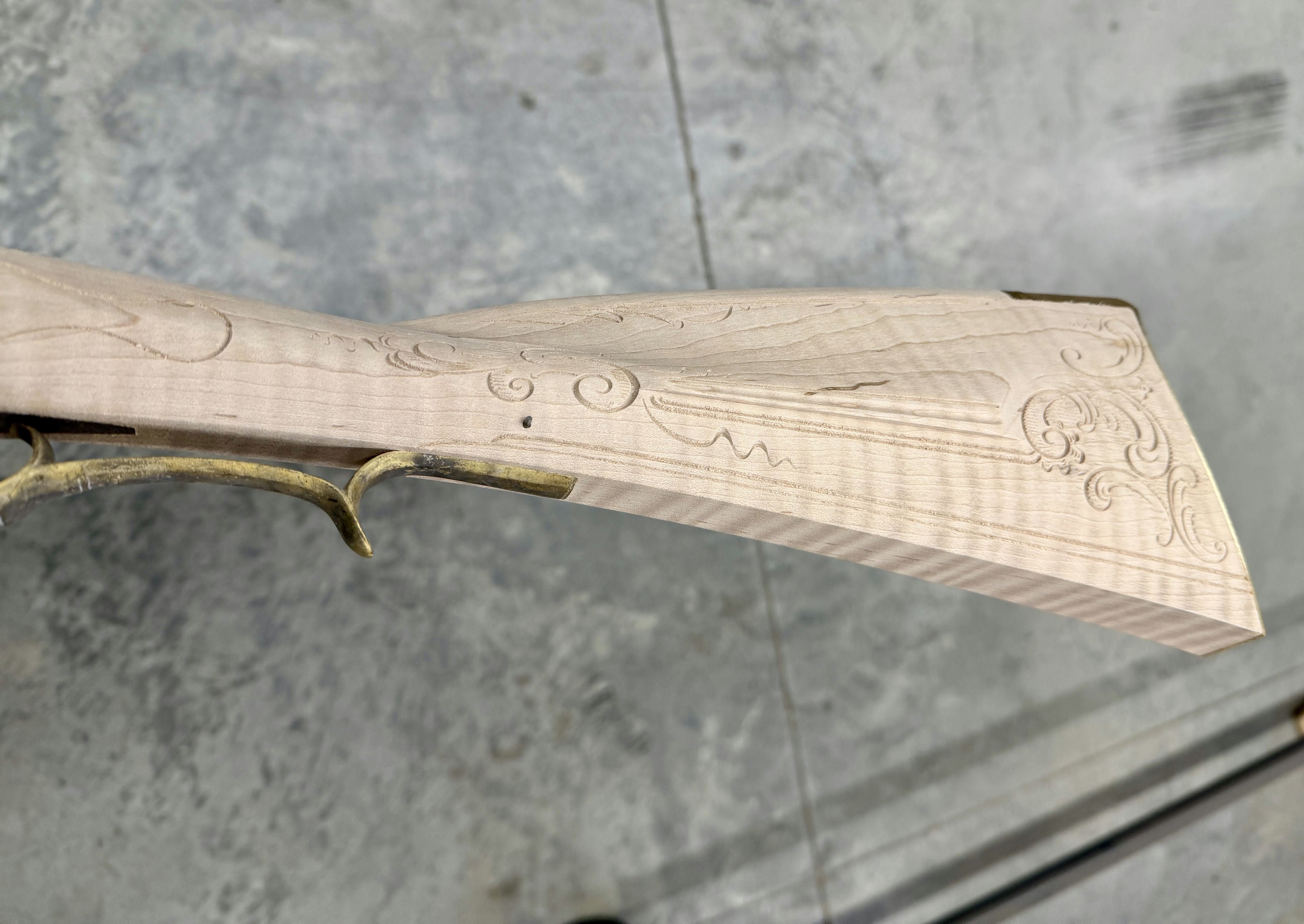 Fancy maple stock with a filled worm hole and stain.