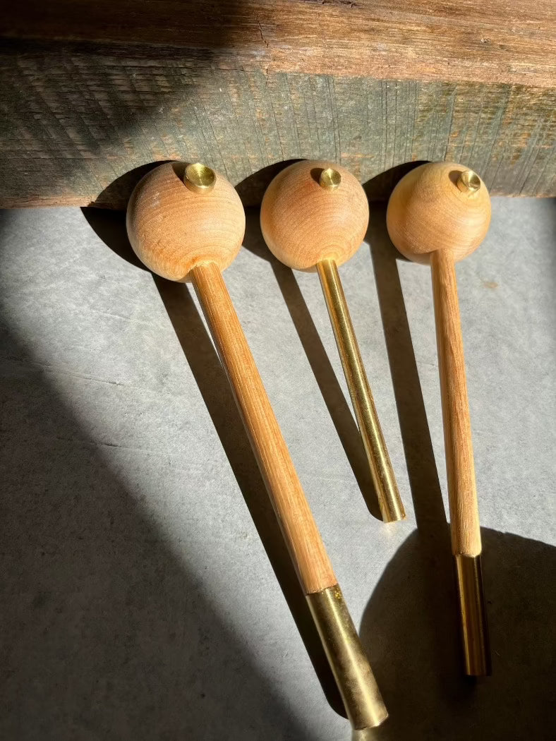 The maple ball is fitted with a short brass stud and a longer concave brass rod (smallest size) or brass tip (larger calibers). Finished in hot linseed oil, with waterproof glue, the brass rod and tip should give a lifetime of service.